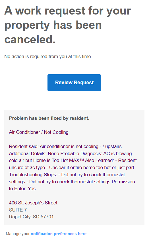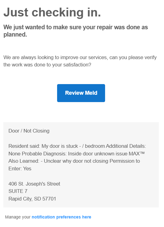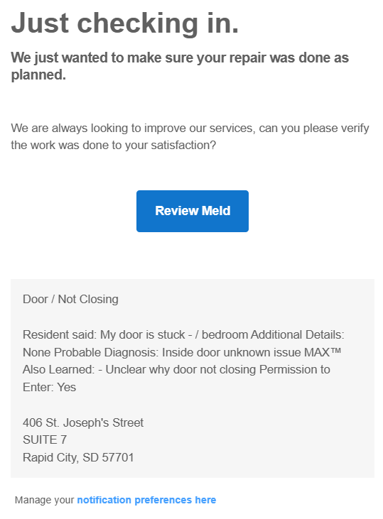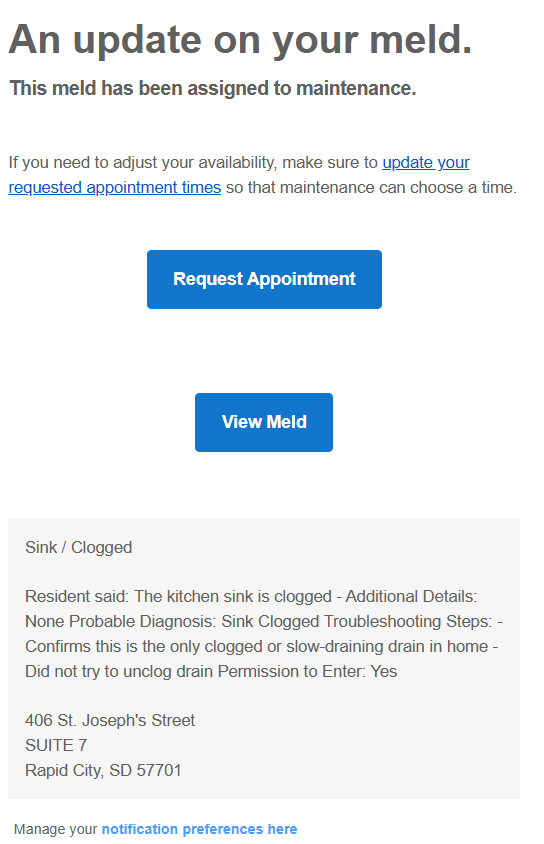 As a resident using Property Meld, you will receive various notifications to keep you informed about maintenance requests and other important updates. These notifications can be sent via email, text, or both, depending on the type of notification and your preferences.