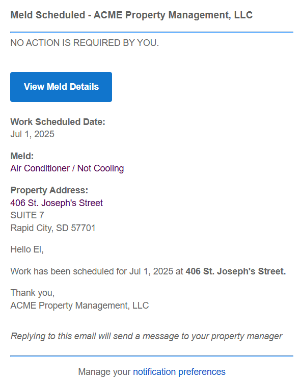 Will only receive a Meld Scheduled notification if the scheduled Meld has “Tenant Presence Required”. No other Meld-related notifications will be sent to unregistered residents.