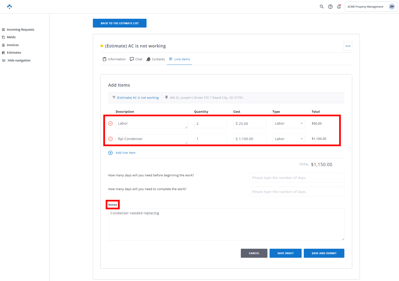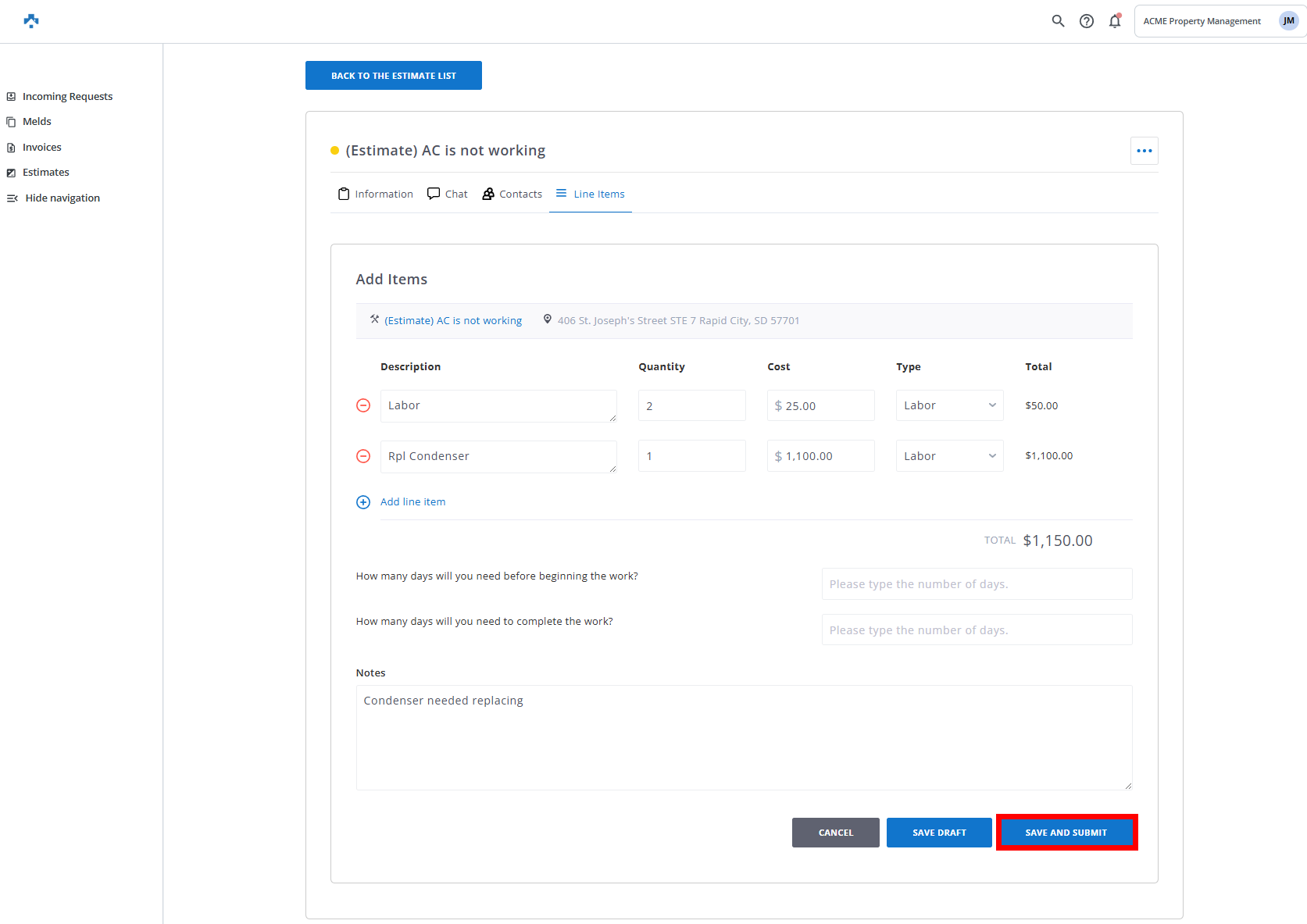 Your estimate has now been submitted to the property manager to review for approval. Once they approve, you will automatically be assigned the meld.