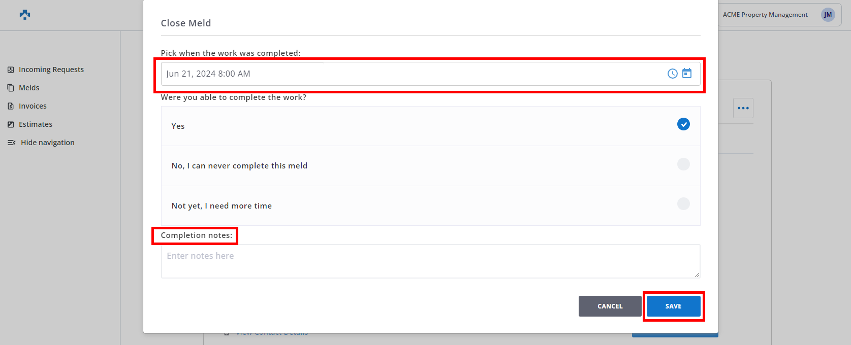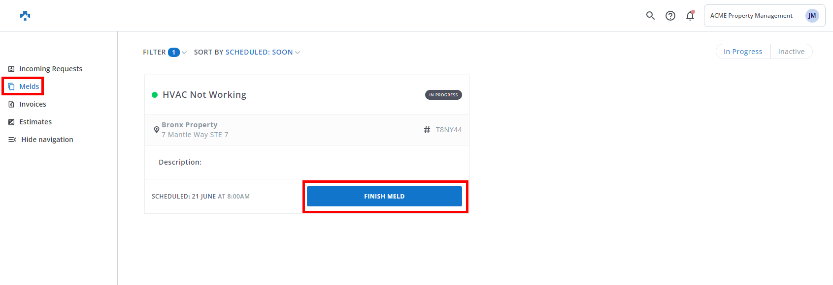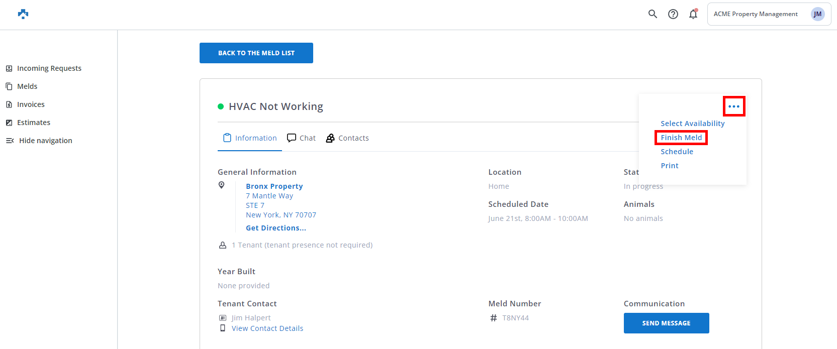 As a Vendor, an email and/or text (if opted-in) notification after the scheduled date and time of the Meld to complete or finish the Meld. This article provides step-by-step instructions for finishing the Meld providing notification to the Property Manager.