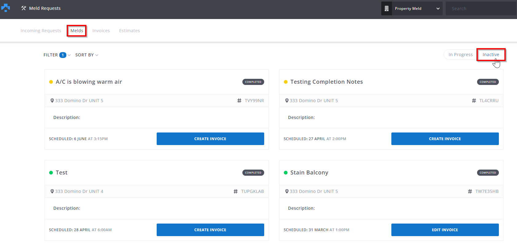 Una vez que hayan iniciado sesión en Property Meld, los proveedores podrán navegar entre solicitudes entrantes, fusiones, facturas y estimaciones.