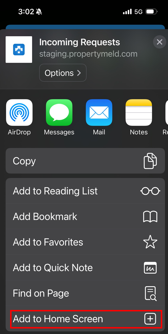 NOTE: You might need to scroll down to find "Add to Home Screen"