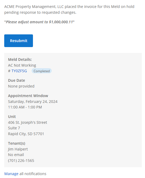 Request Updates/Changes to Invoice (Manager to Vendor)