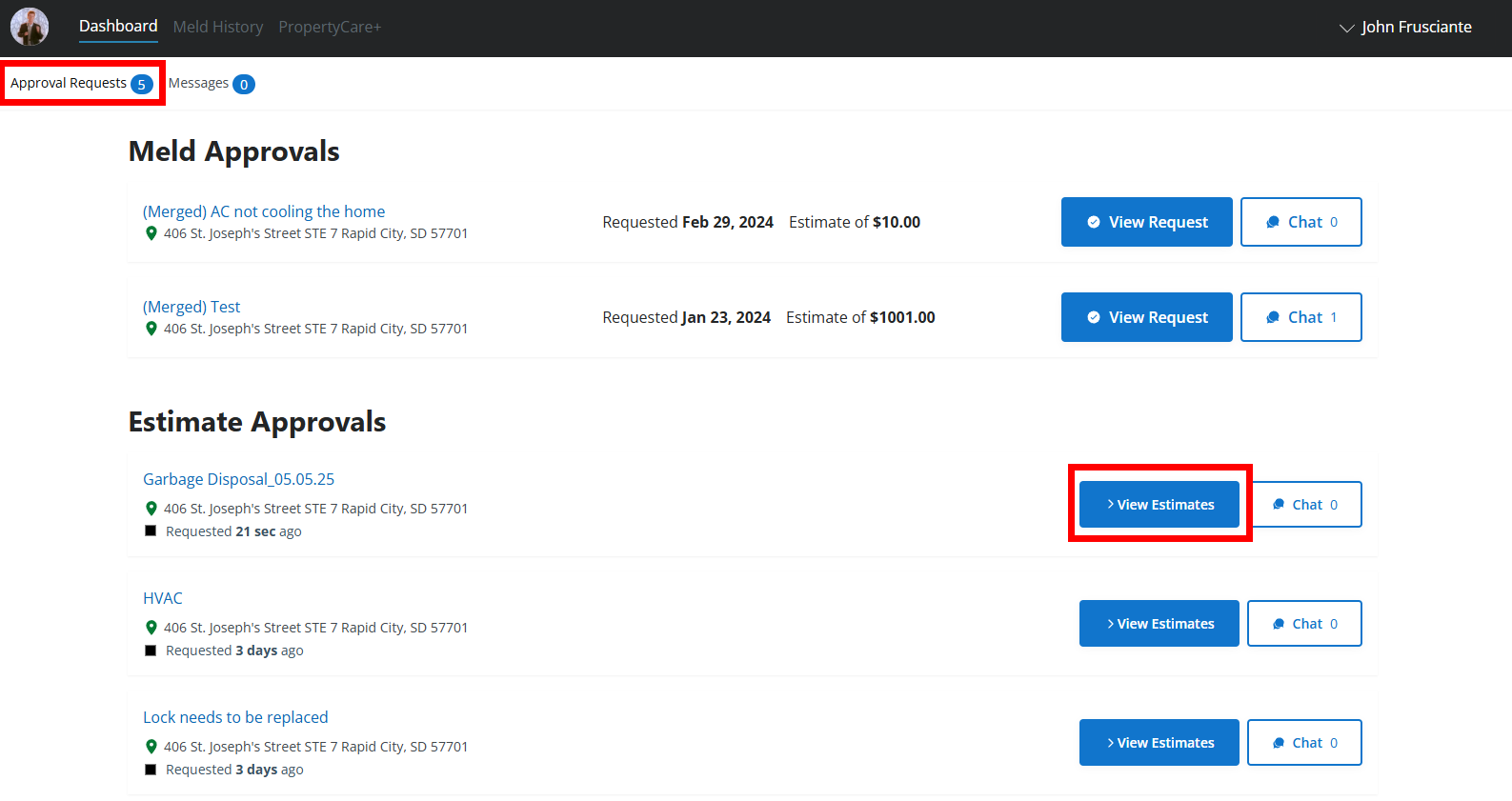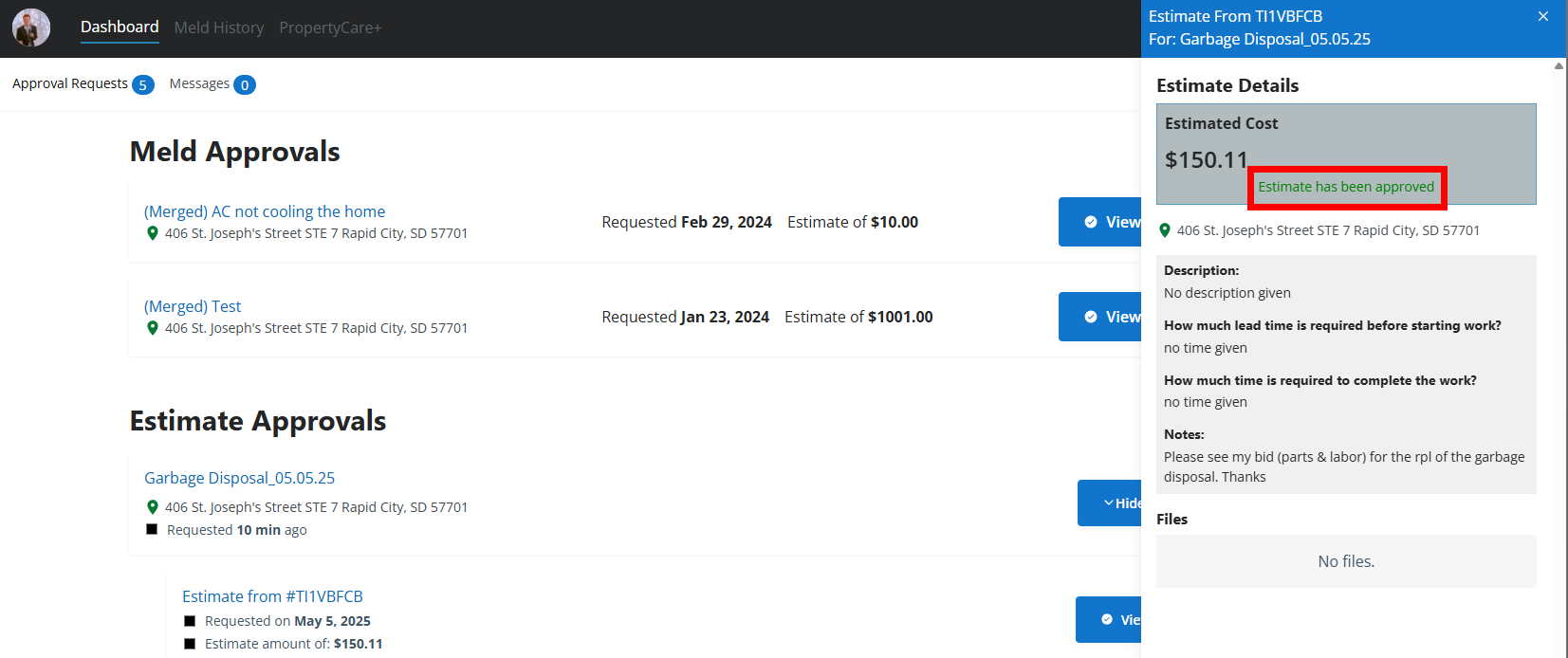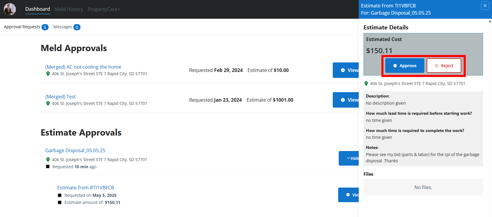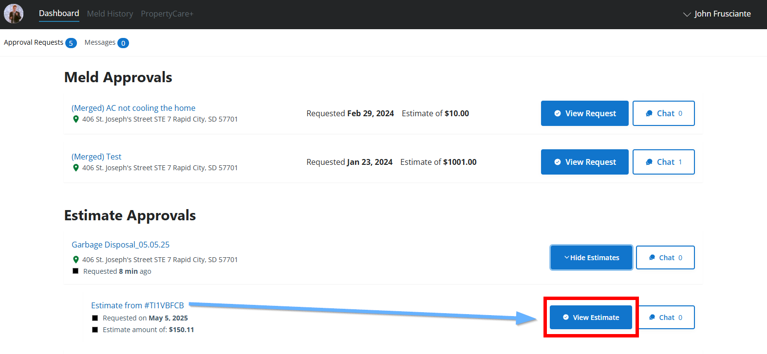- Log in to your Property Meld Owner Hub account and navigate to the Approval Requests tab under the Dashboard section. Find the estimate request you want to respond to and click View Estimates.
