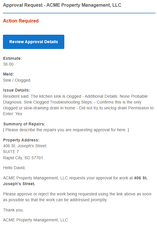 For repairs requiring your approval before proceeding, this notification will include estimated costs and action buttons to approve or deny the request.