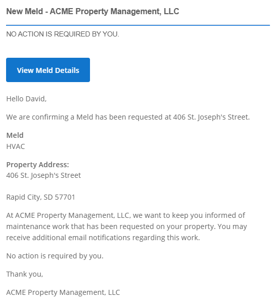 You’ll receive this notification when a new repair Meld is assigned to a vendor. It provides basic details about the request and next steps.