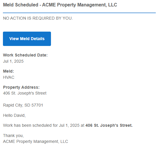You’ll receive this notification when a new repair Meld is assigned to a vendor. It provides basic details about the request and next steps.