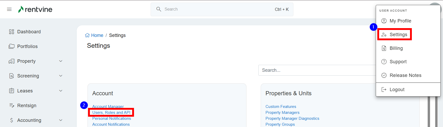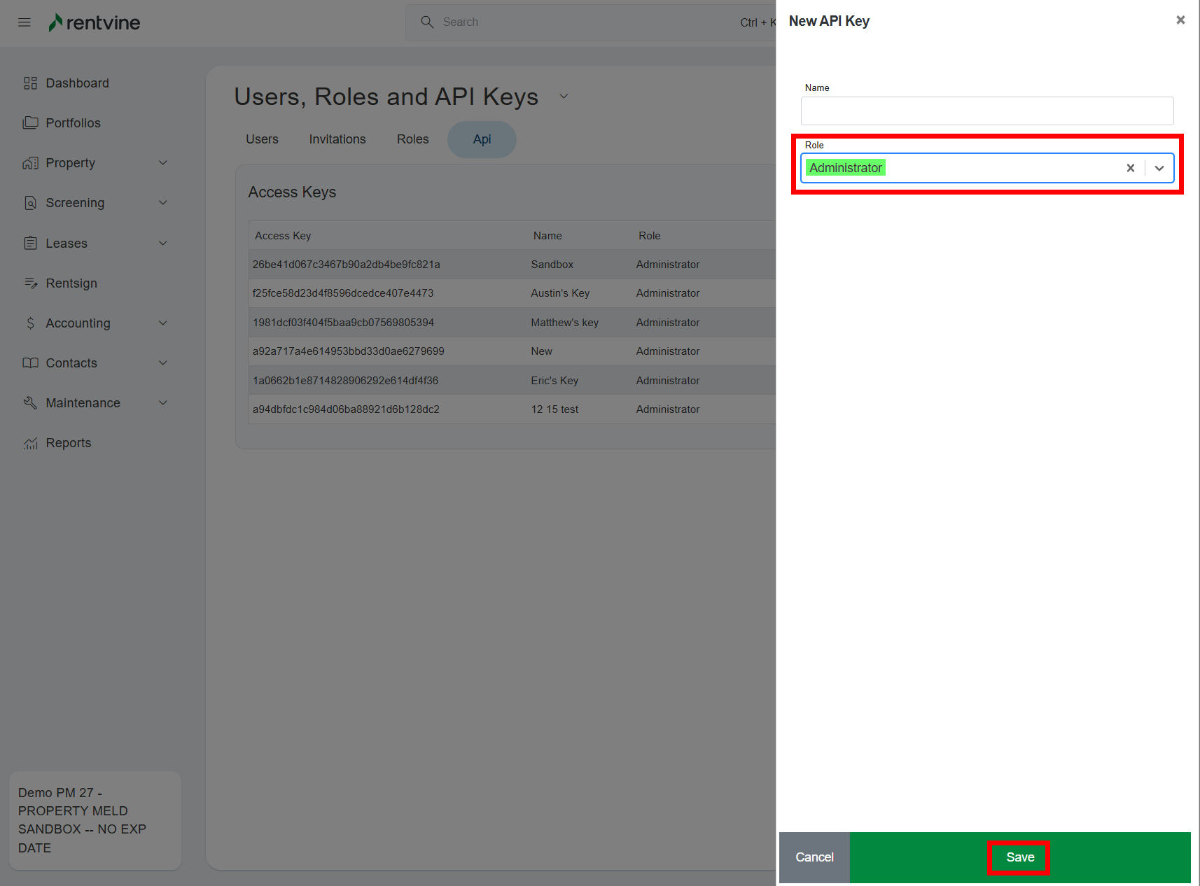 IMPORTANT: When creating the APIs to send to Property Meld, select the highest Administrator role in Rentvine. See Step 3 below for a screenshot of what this looks like in Rentvine.