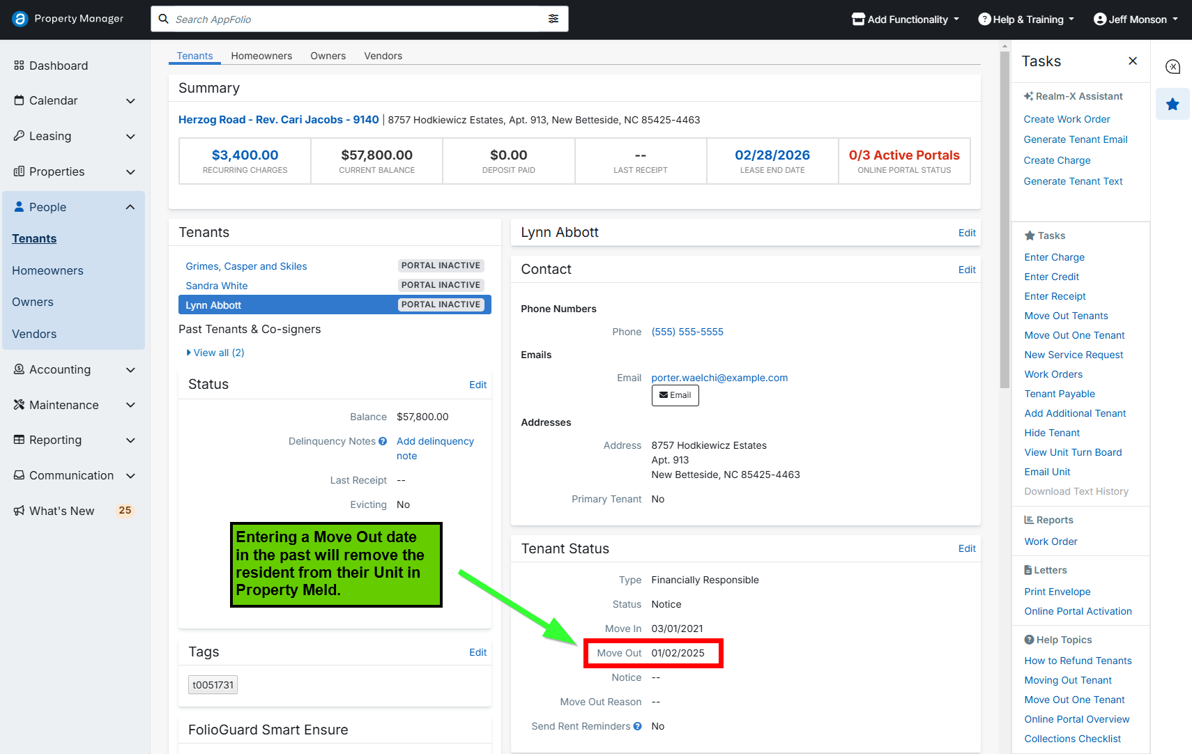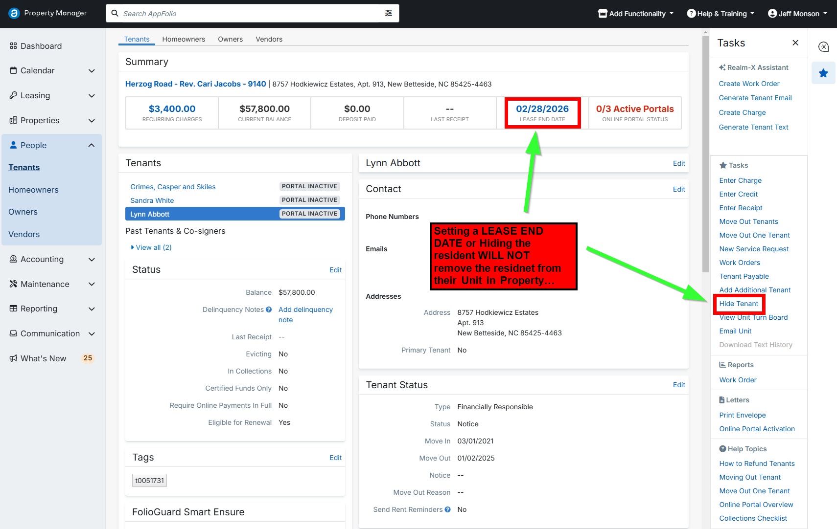 - Hiding a resident in AppFolio (this does not move them out in Meld).