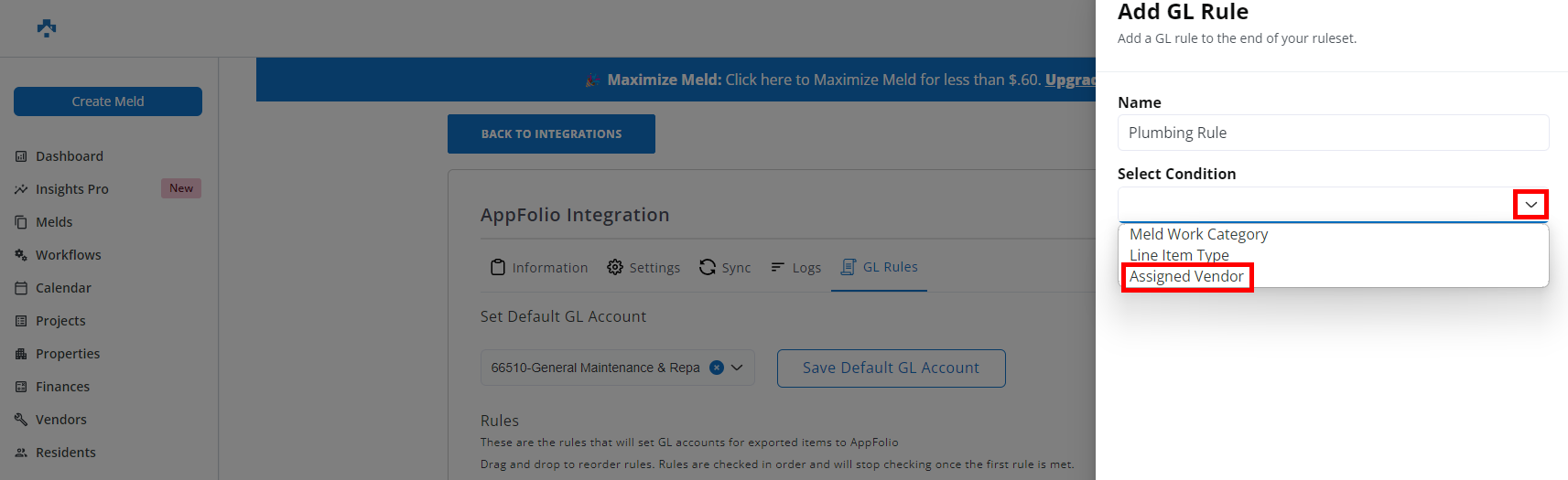 NOTE: Other available conditions are Line Item Type and Meld Work Category. For this article, Assigned Vendor was selected.