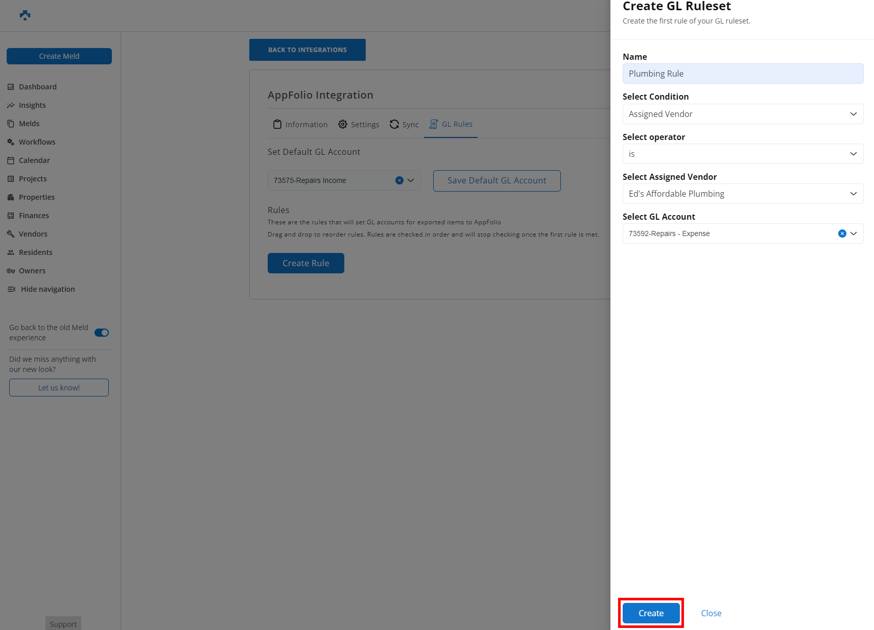 After setting your GL Rule criteria, click Create.