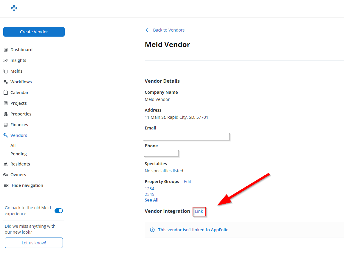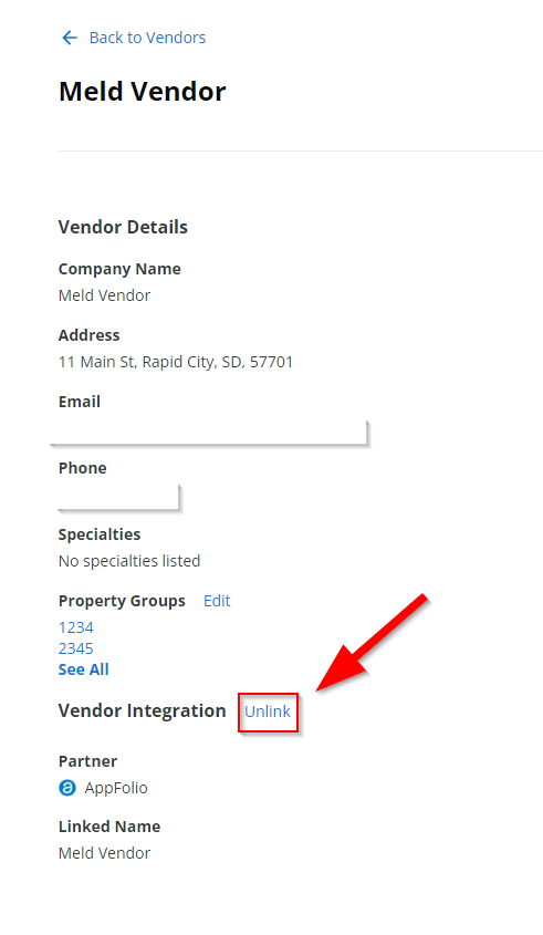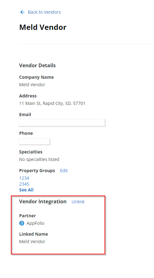 The linked AppFolio Vendor will now appear under the Vendor Integration Section.