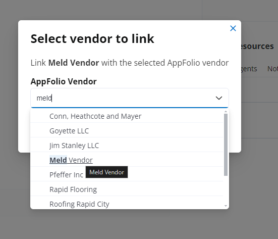 Click the matching AppFolio Vendor from the dropdown list, then click LINK VENDOR.