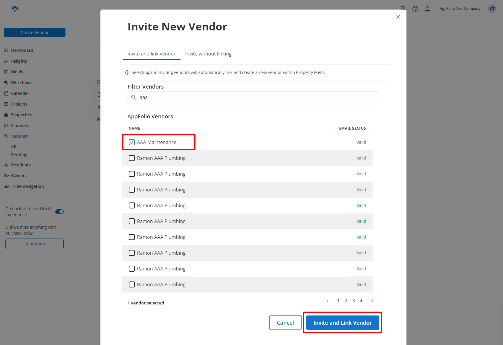 AppFolio contains many Vendors (e.g. maintenance-related and not maintenance-related), you will need to manually select specific Vendors to import (add and invite new Vendor) or link (associated with existing Vendor) in Property Meld. After following the below steps, newly added Vendors will receive an email invitation to register as a Vendor from Property Meld.