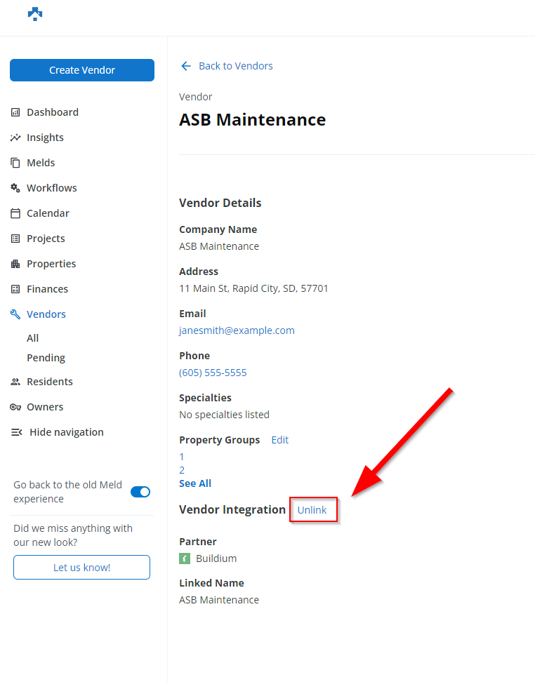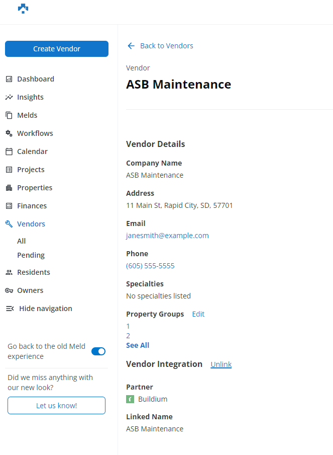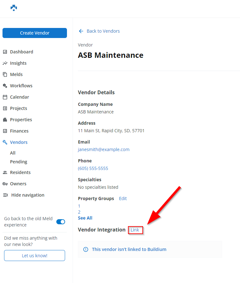 The linked Buildium Vendor will now appear under the Vendor Integration Section.