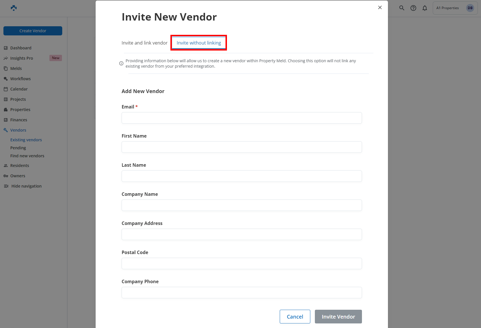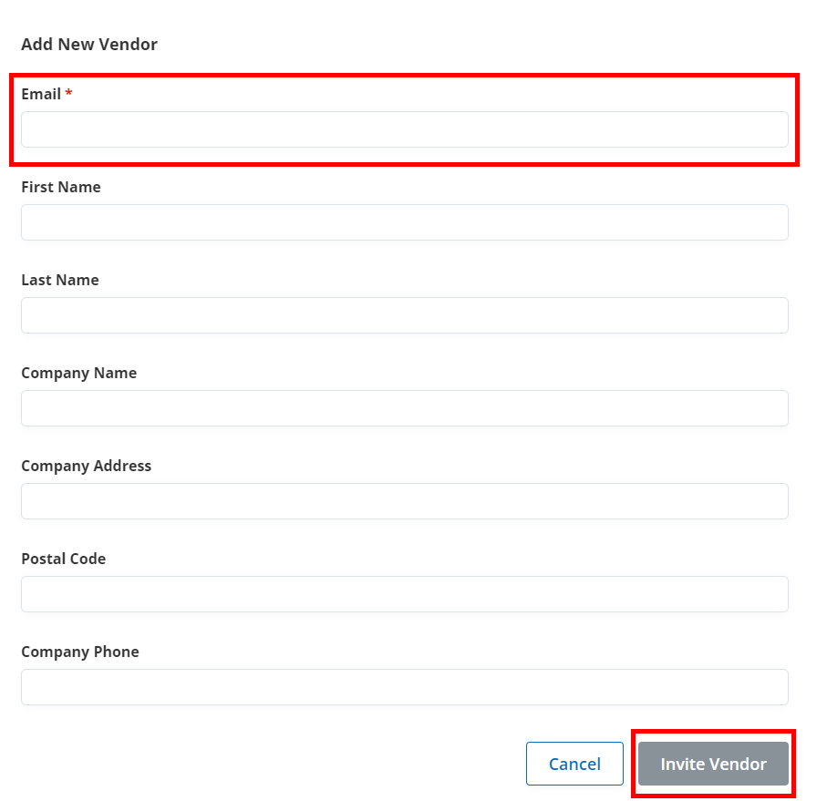 You can just invite the Vendor with only an Email address. The remaining fields (First Name, Last Name, Company Name, etc.) are optional. When finished click Invite Vendor.