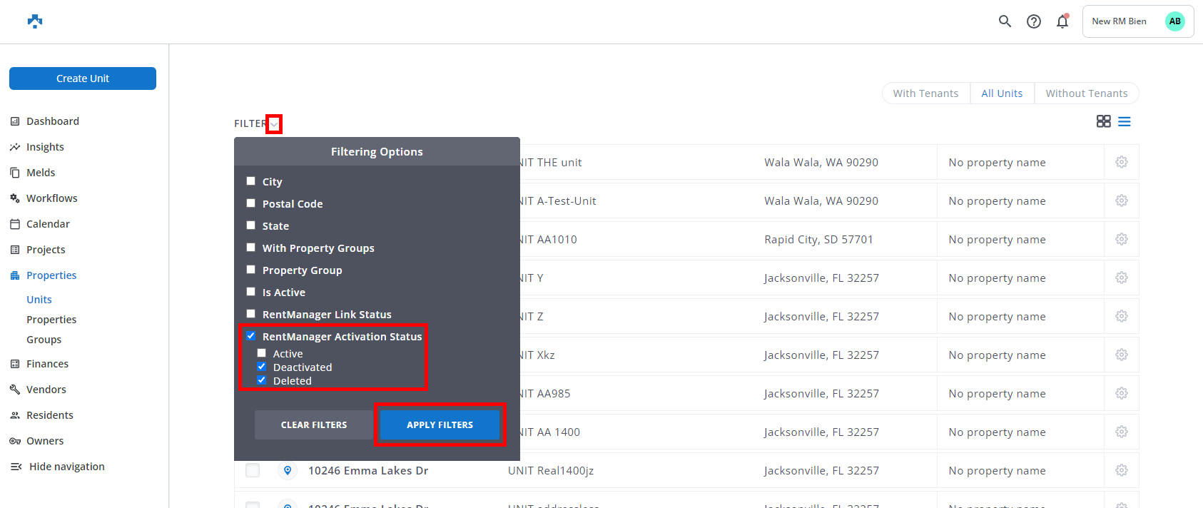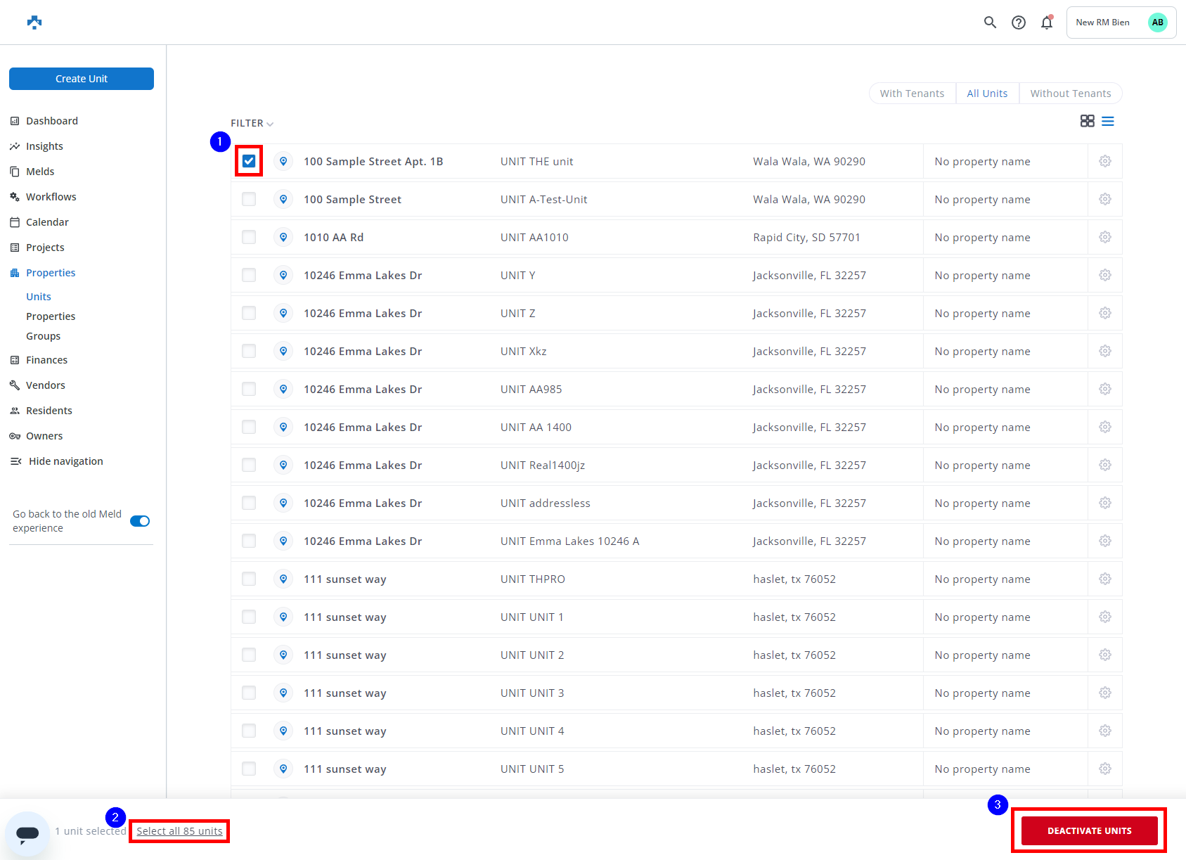 - Check the box to the left of the Unit/Property name