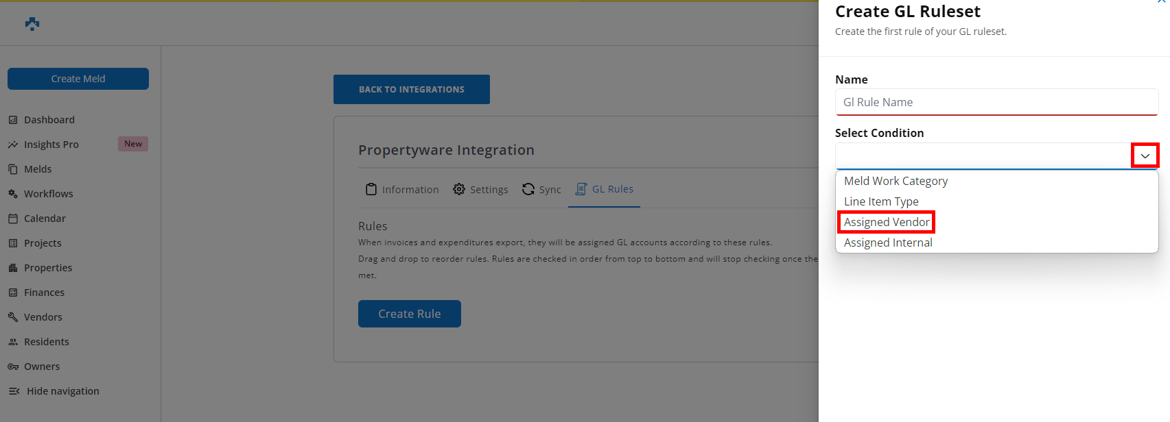 NOTE: Other available conditions are Line Item Type and Meld Work Category. For this article, Assigned Vendor was selected.