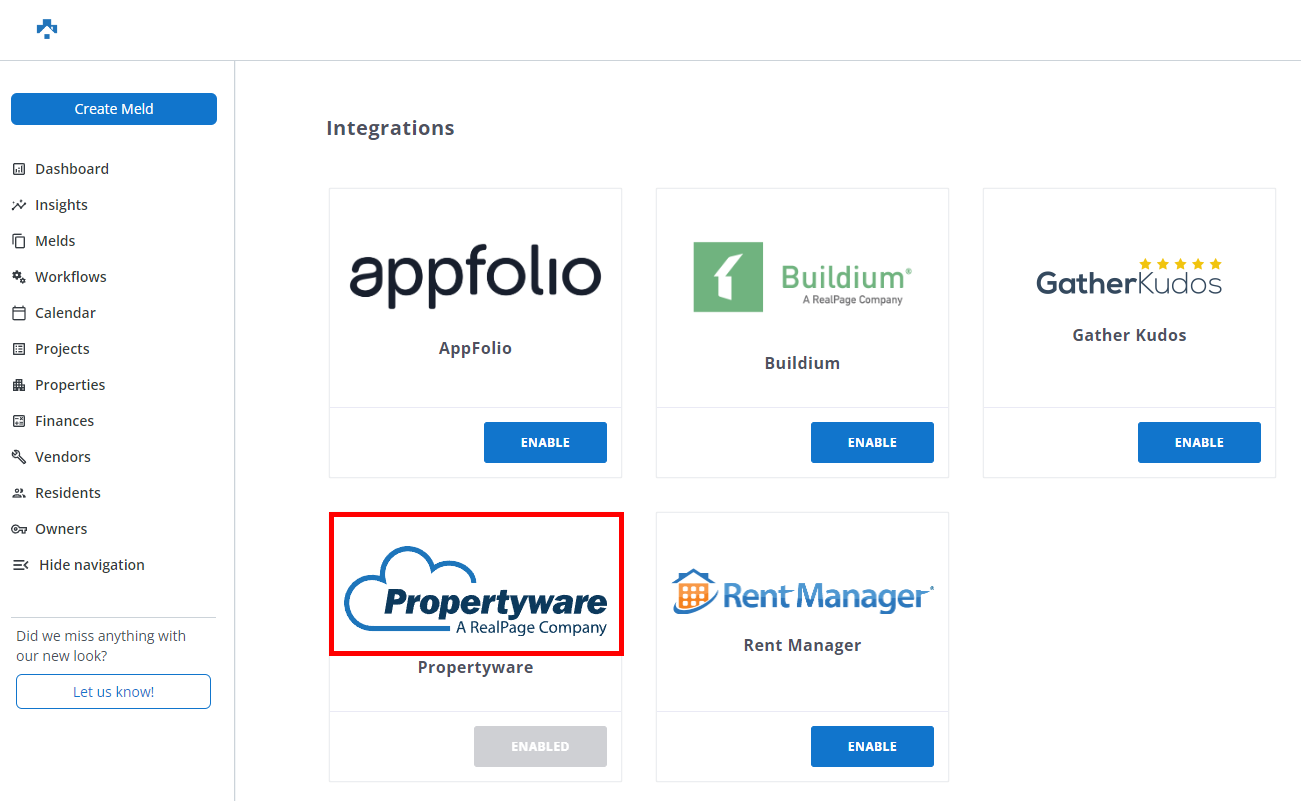 If interested in enabling the Propertyware Integration, please send a request to support@propertymeld.com.