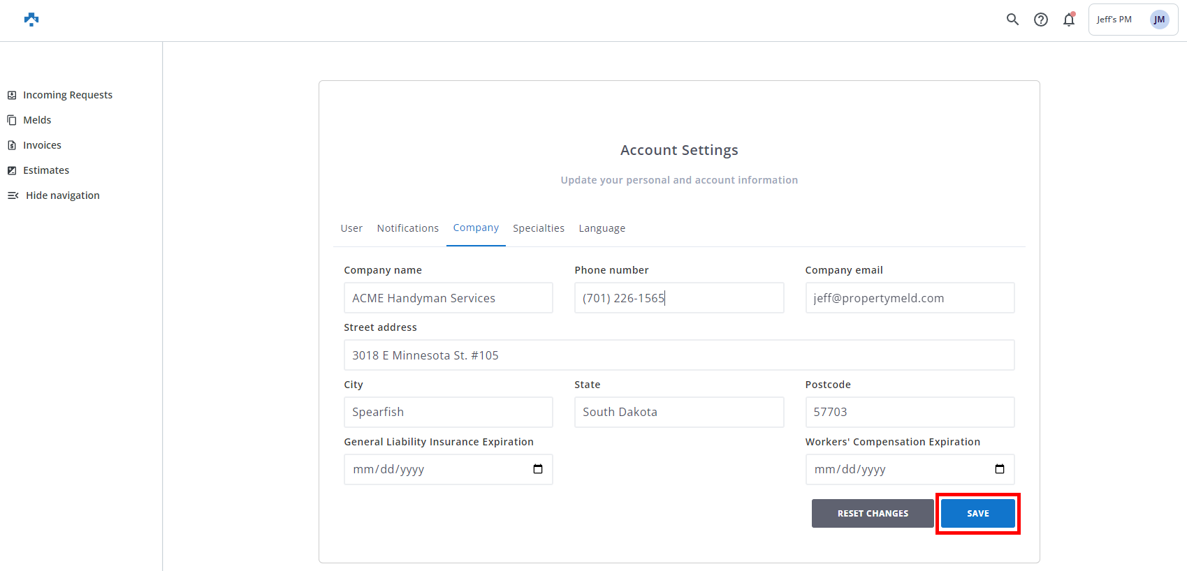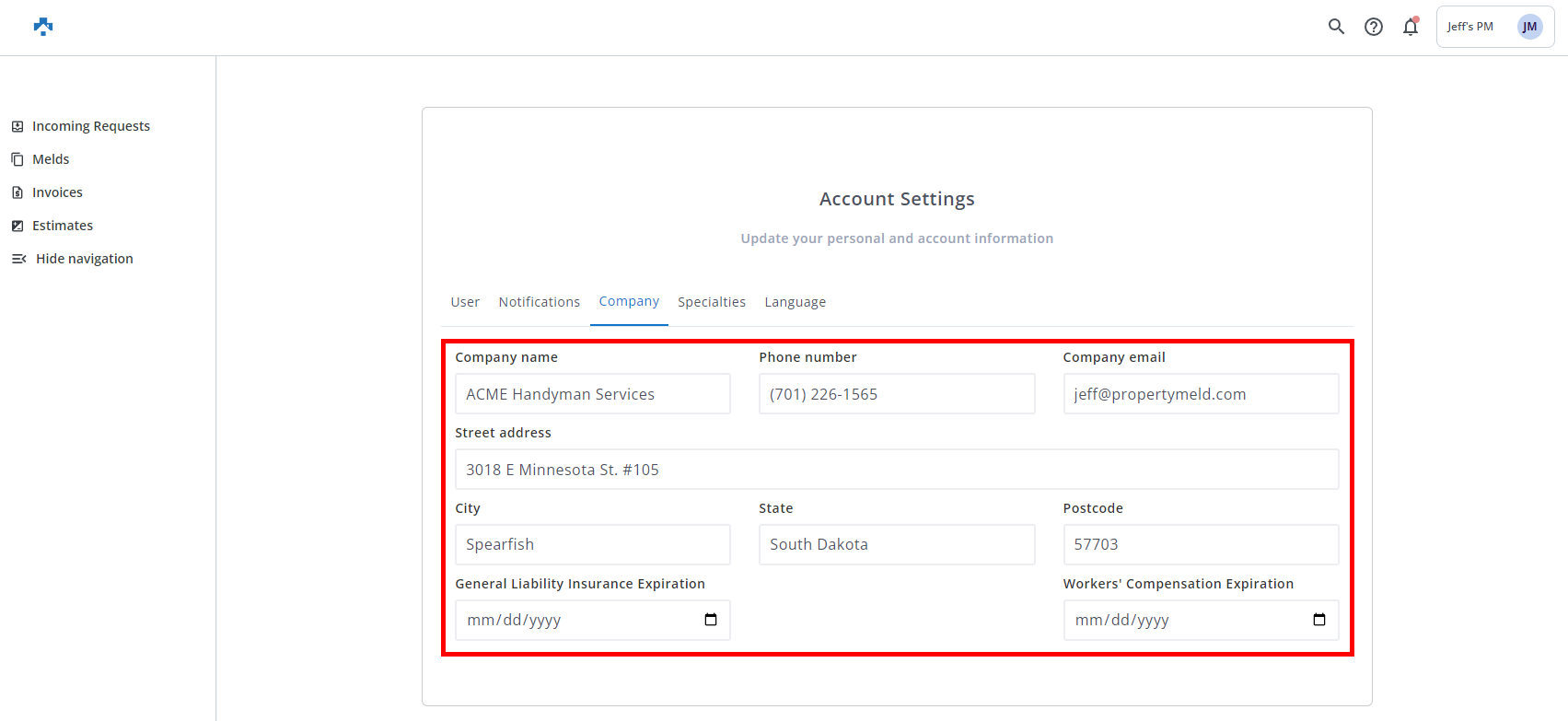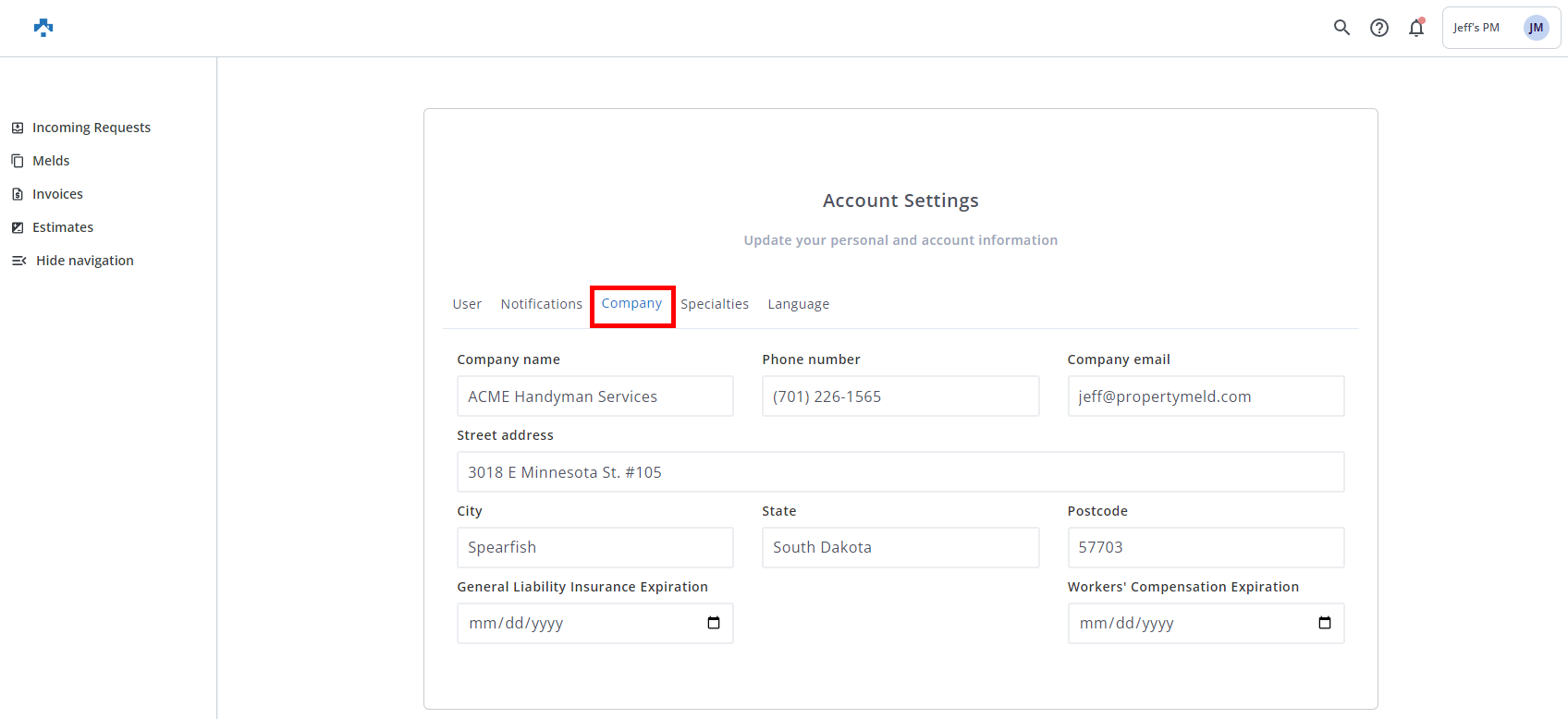 The Company page in Account Settings will allow you to set your Vendor company's name, email address, phone number, and physical address.