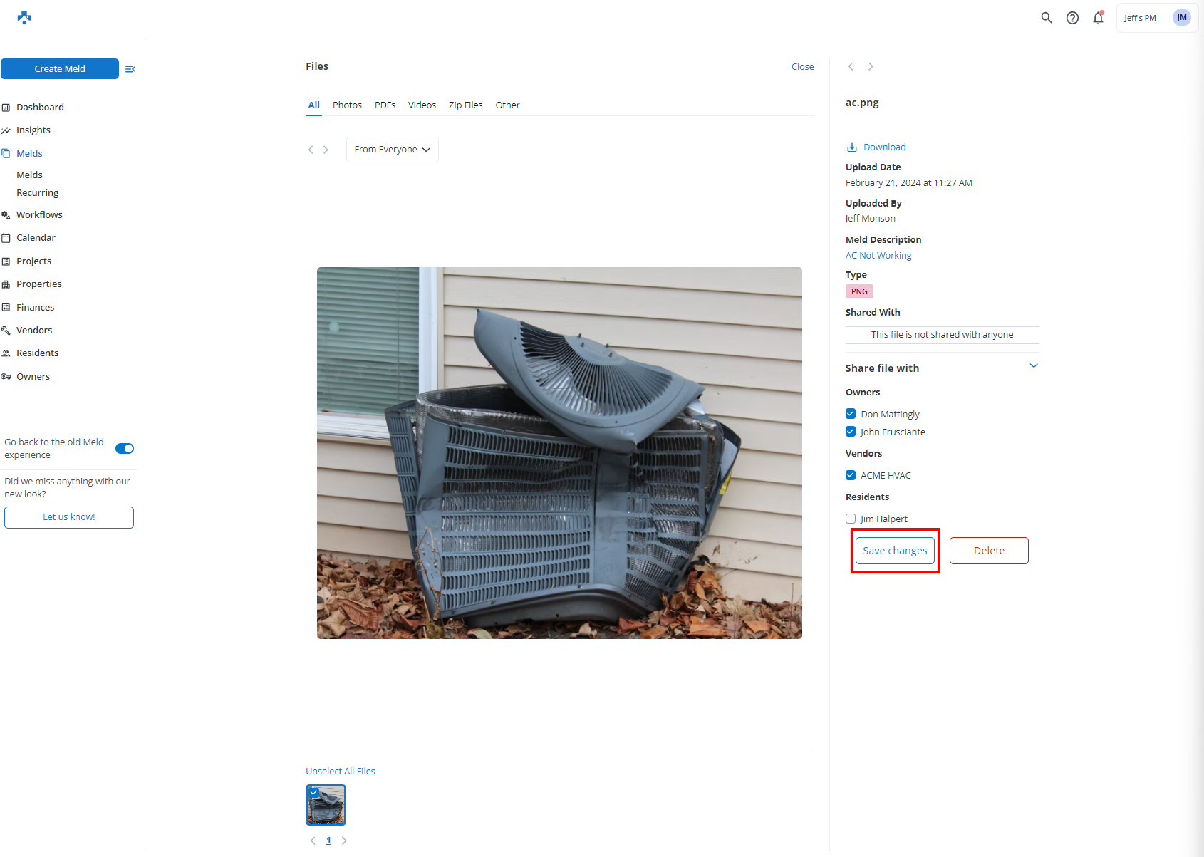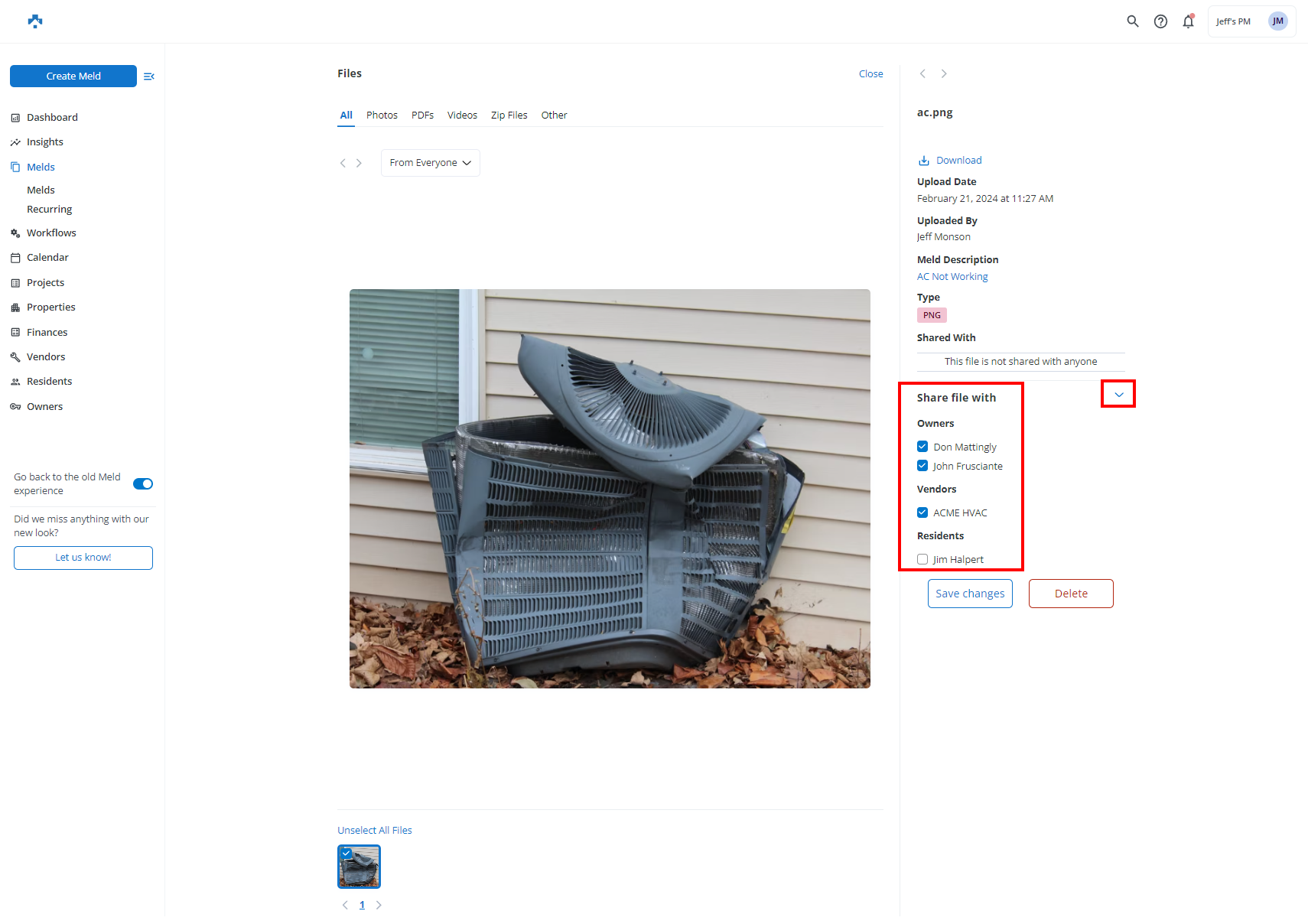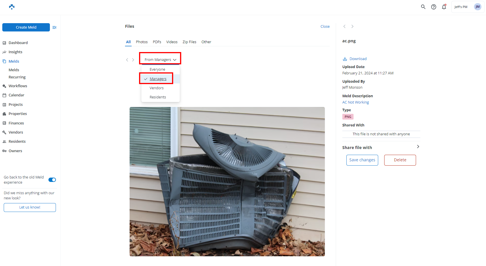 Any user role (e.g. Agent, Maintenance, Vendor, Resident) can upload a file to a Meld from either a computer or mobile device.  By default, an Agent, Maintenance Coordinator, or assigned Maintenance Technician can view the files attached to a Meld.  All other users (e.g. Residents, Vendors, and Owners) need a file to be shared from the Meld in order to view the file.  The exception is if the Vendor or the Resident uploaded the file.