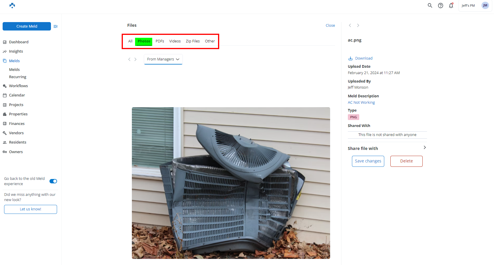 Uploaded files are categorized by Resident filesVendor files, and Manager files when viewing a Meld. To view who uploaded the file or photo, simply double-click the file to open screen where this can be seen (refer to screenshot below illustration how this looks).