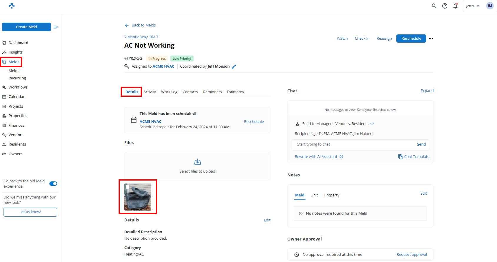 • Files can be uploaded to a Meld, Resident, or Vendor.