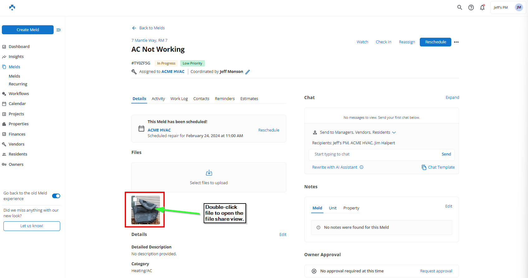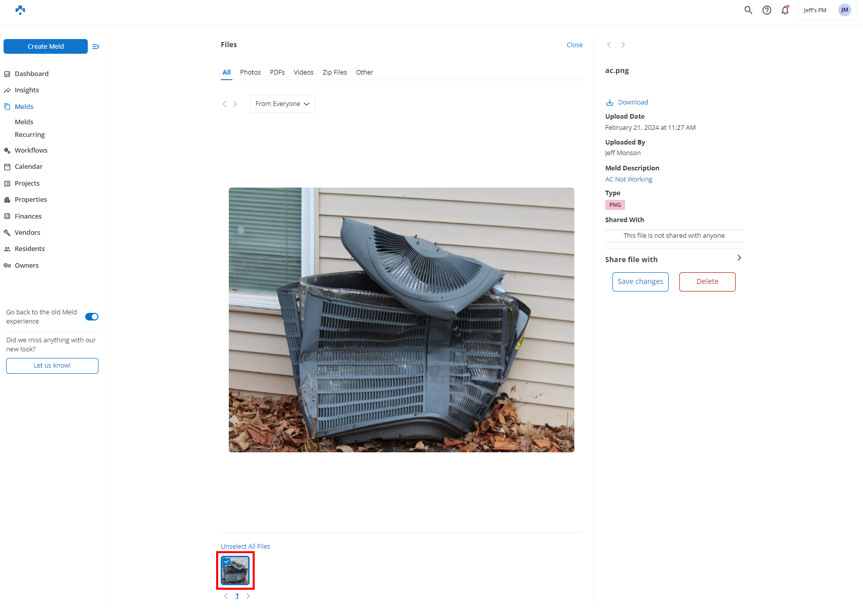 Any user role (e.g. Agent, Maintenance, Vendor, Resident) can upload a file to a Meld from either a computer or mobile device. By default, an Agent, Maintenance Coordinator, or assigned Maintenance Technician can view the files attached to a Meld. All other users (e.g. Residents, Vendors, and Owners) need a file to be shared from the Meld in order to view the file. The exception is if the Vendor or the Resident uploaded the file.