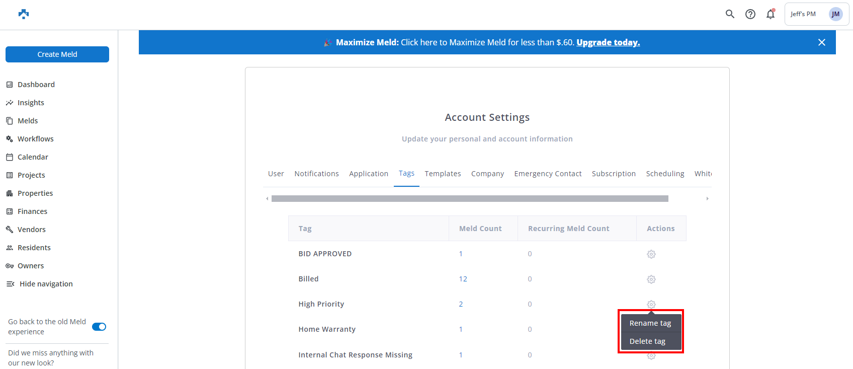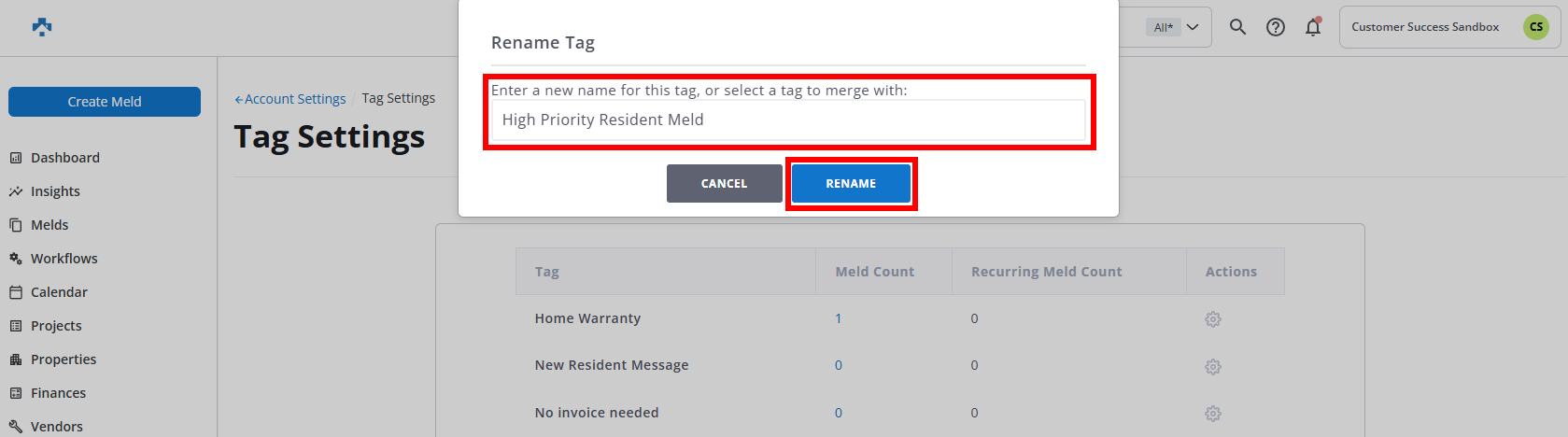 In this example, a Tag is being renamed from High Priority to High Priority Resident Meld.