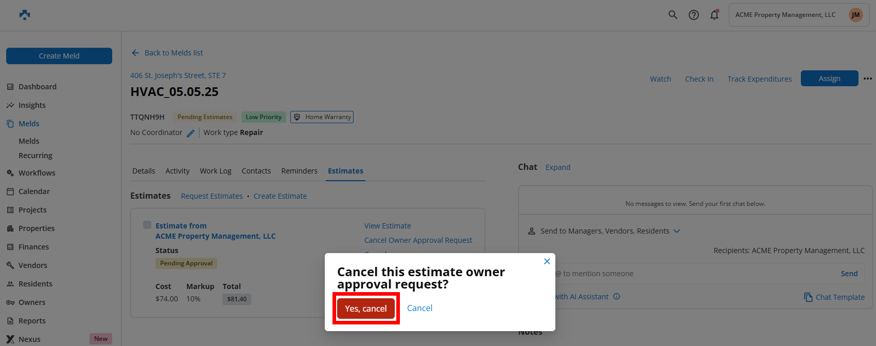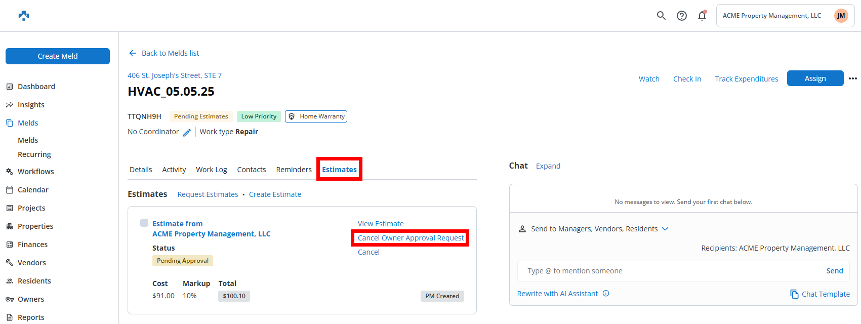 From the open Meld, click the Estimates tab, and then click Cancel Owner Approval Request.