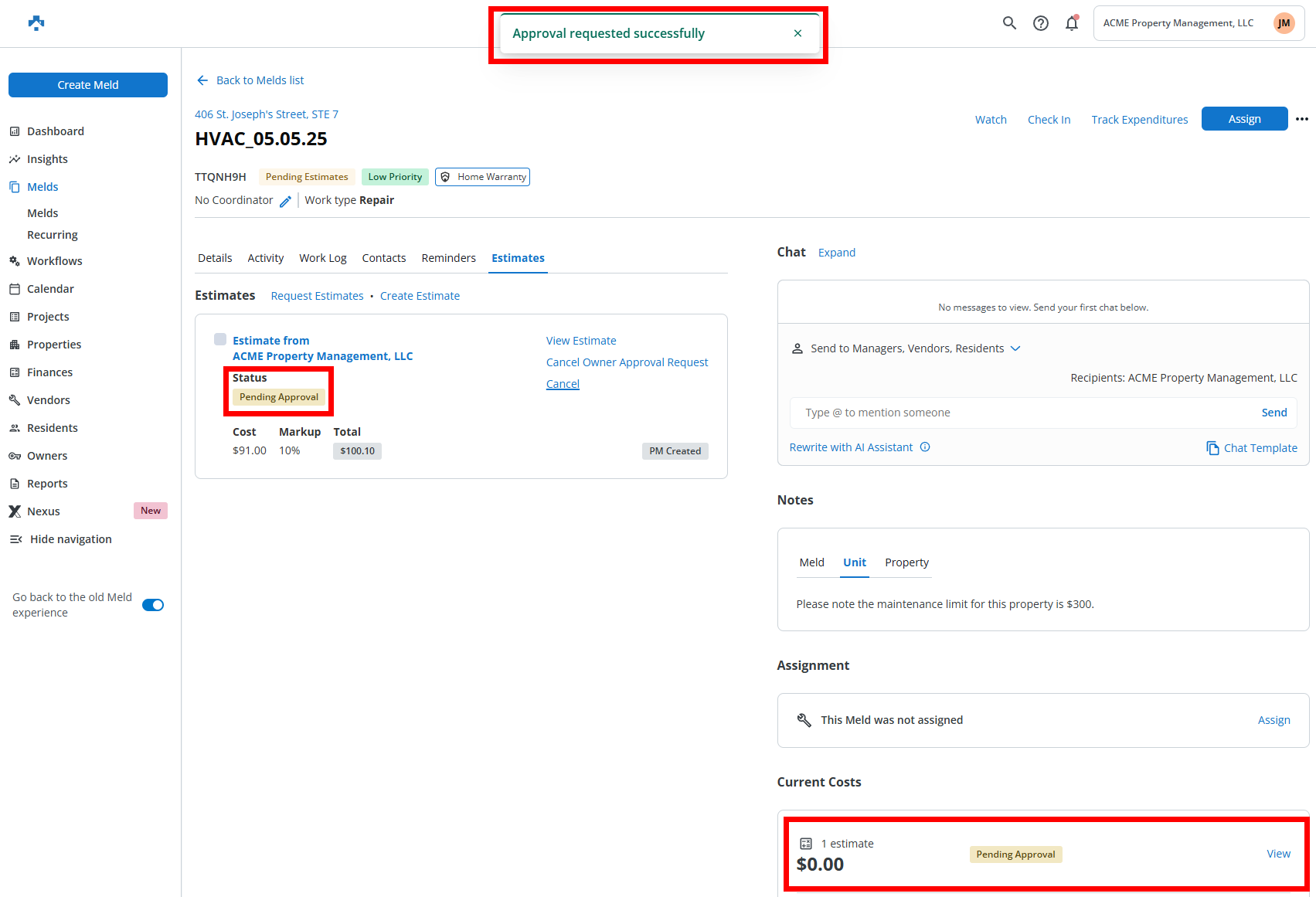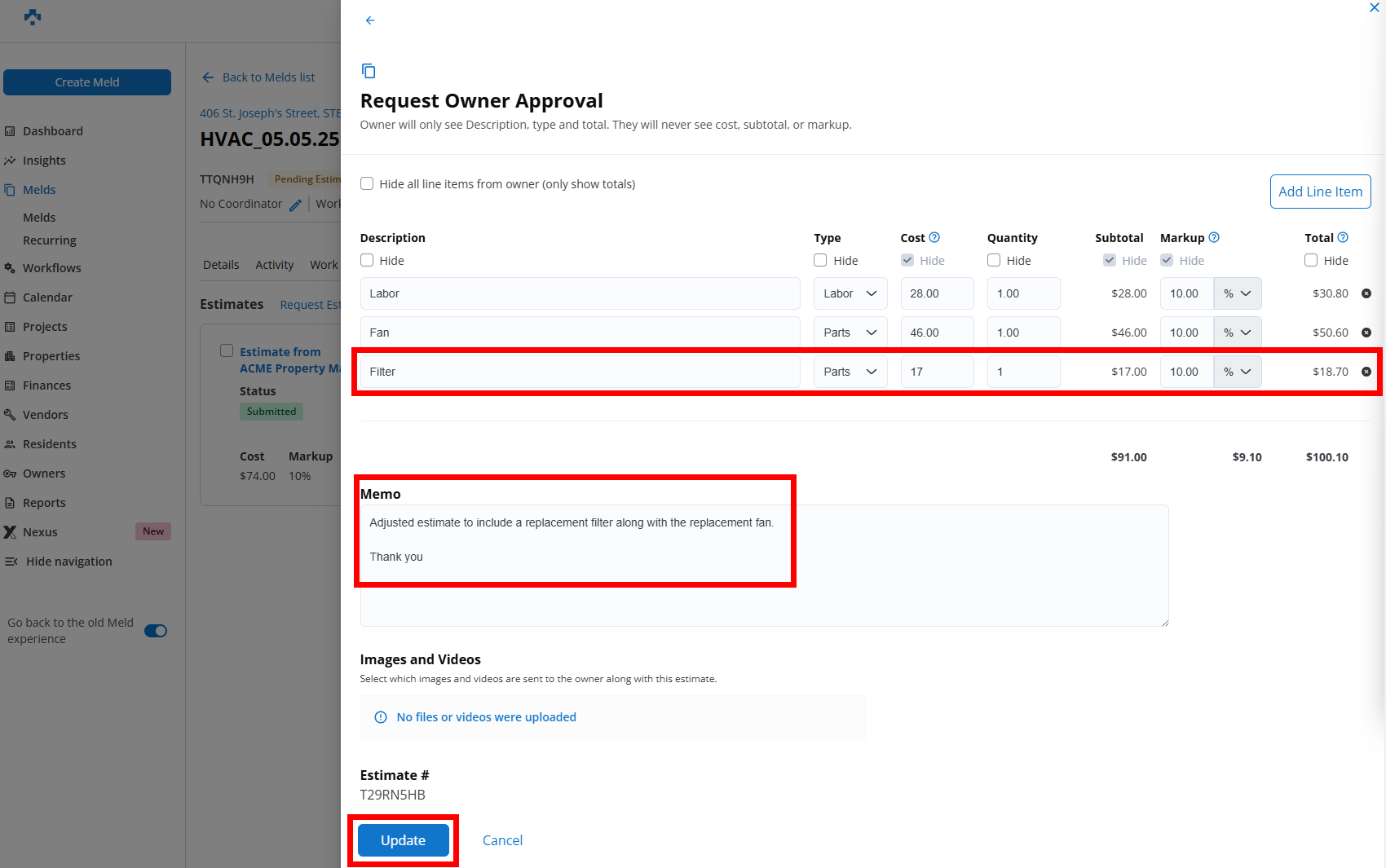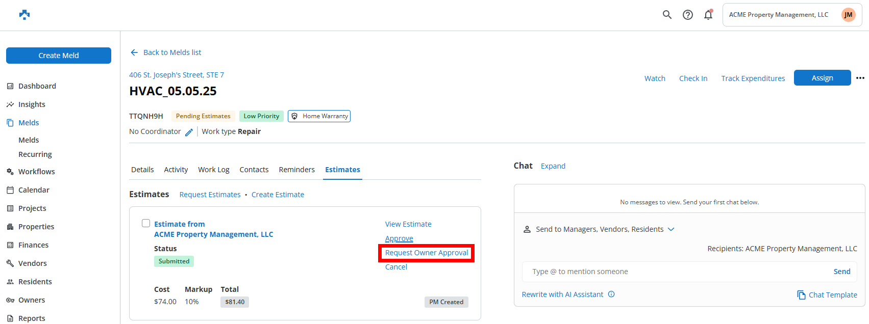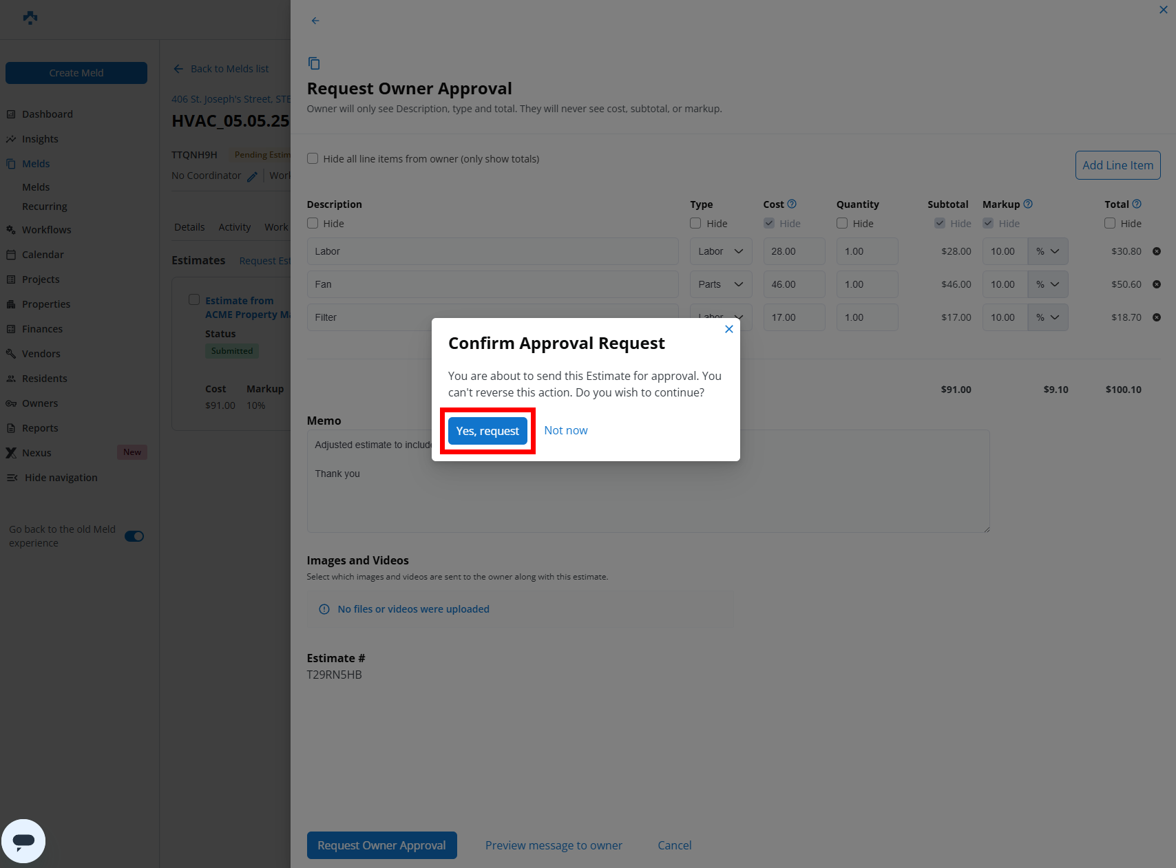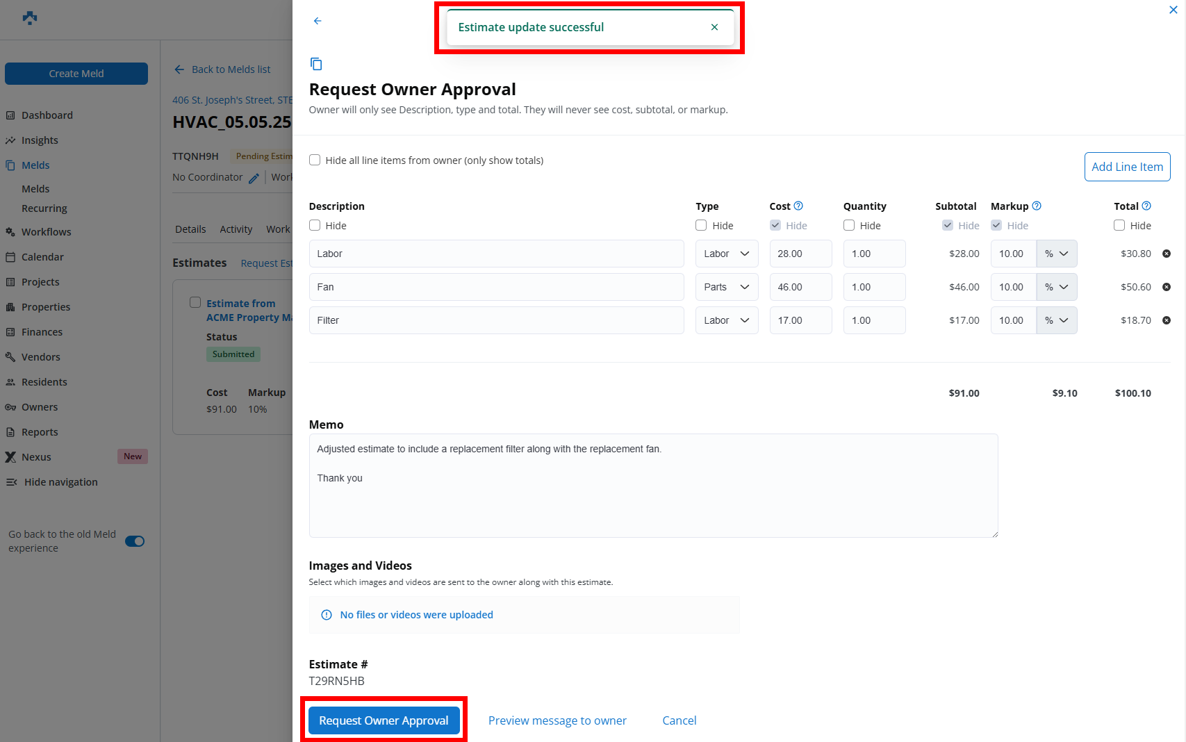 Sometimes, after submitting an estimate for approval, updates or changes may be needed—like adjusting pricing, adding line items, or swapping out vendors. When that happens, you can easily re-request approval from the property owner right from within Property Meld. This ensures they’re reviewing the most accurate version of the estimate, keeping everything transparent and moving forward without delays.