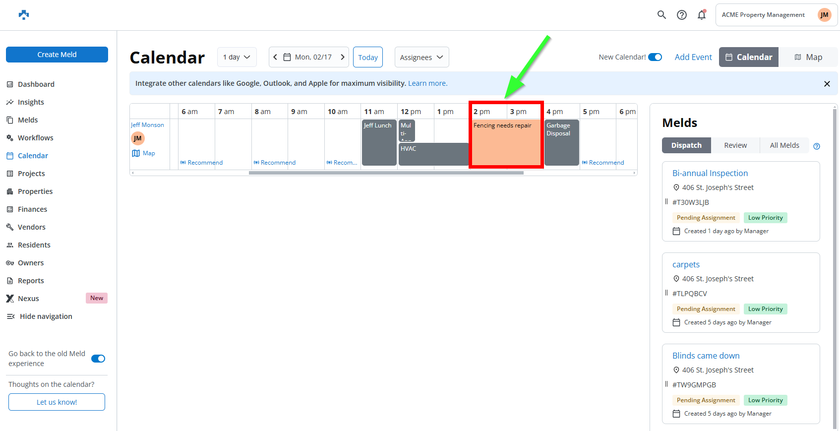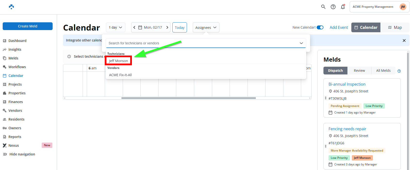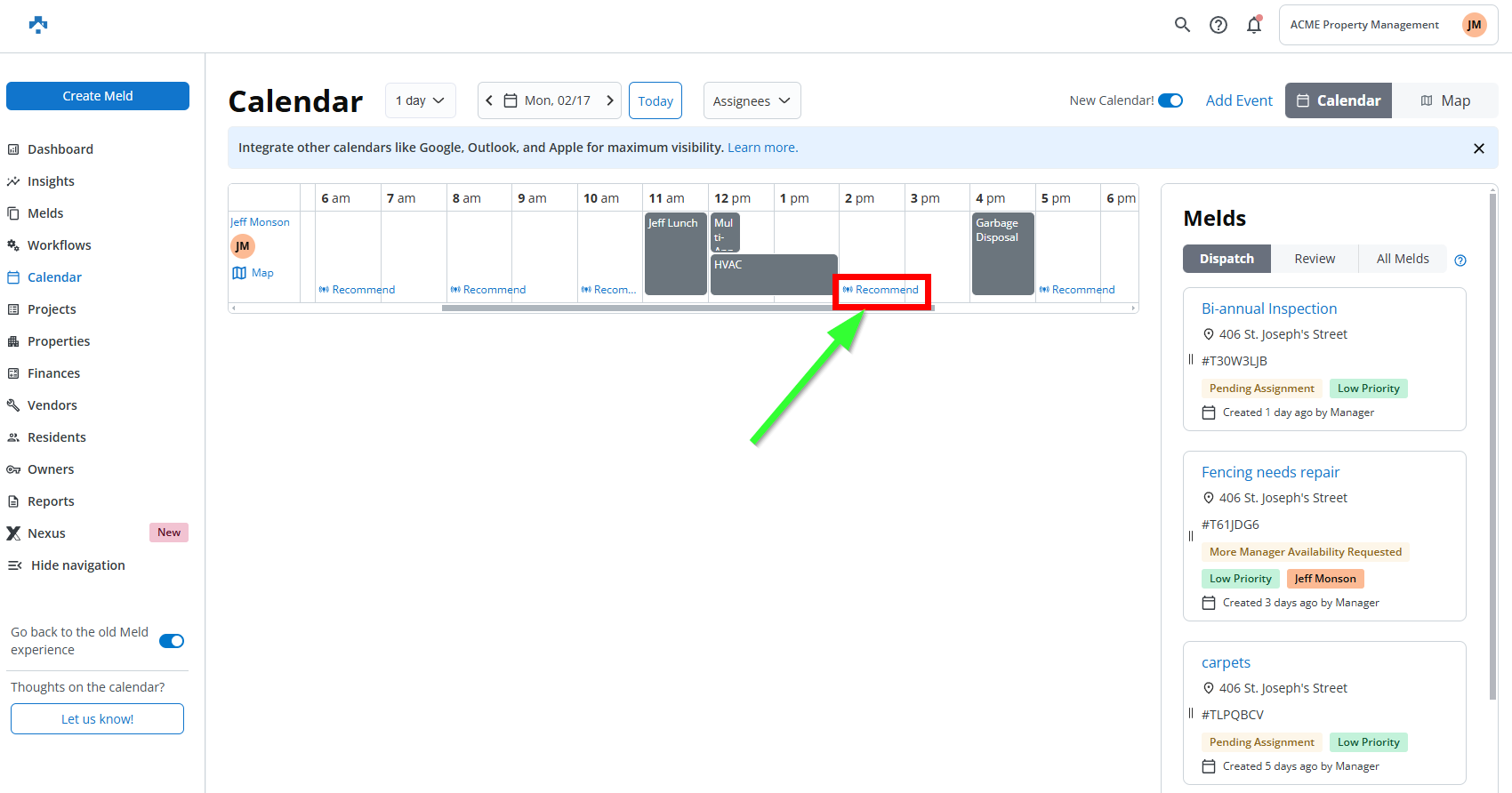 The new Recommendations feature in Property Meld’s Scheduler 2.0 release provides intelligent suggestions for assigning jobs to technicians. These recommendations are based on factors such as proximity to the next job, job priority, and resident availability. The feature helps coordinators make faster, data-driven scheduling decisions, reducing manual workload while still allowing them to retain control over final assignments. This enhancement speeds up the scheduling process and ensures that the most efficient and logical choices are made, improving overall workflow and technician productivity.