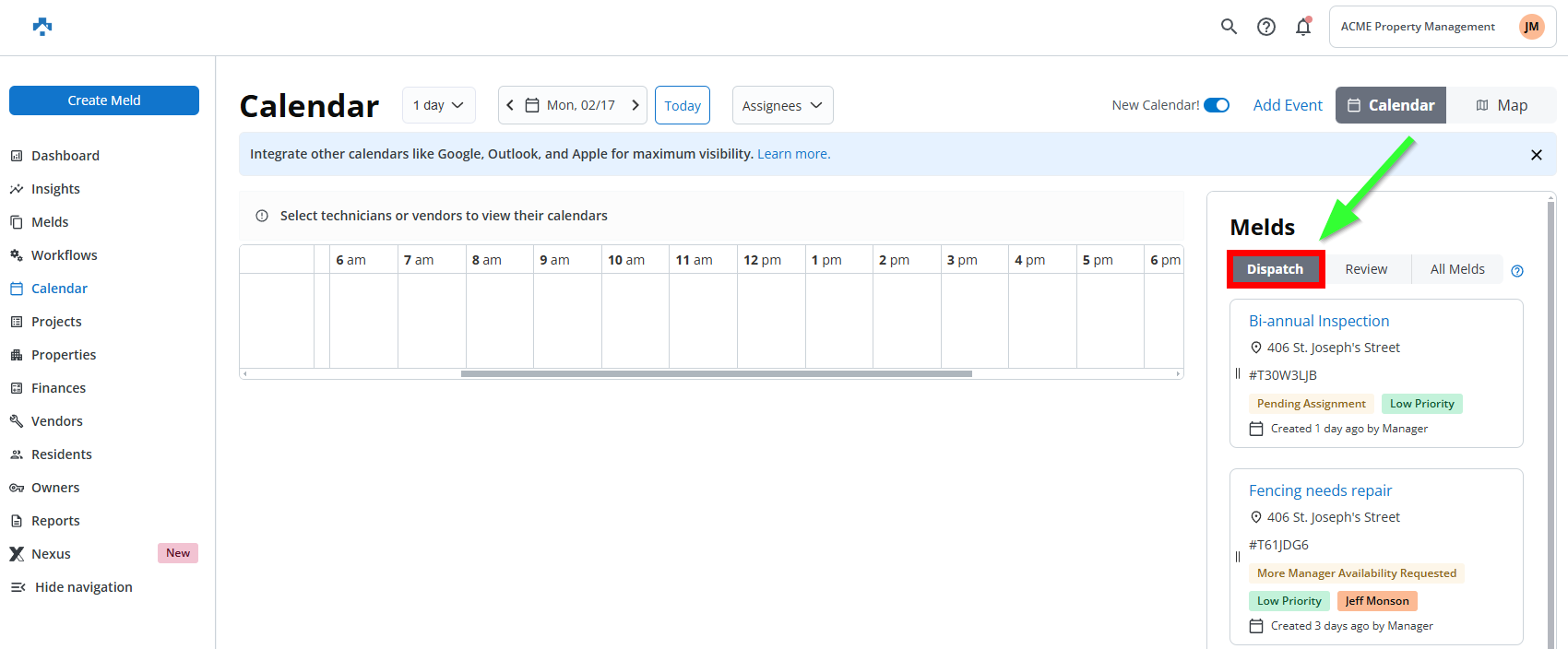 Click Calendar and then click the Dispatch tab.