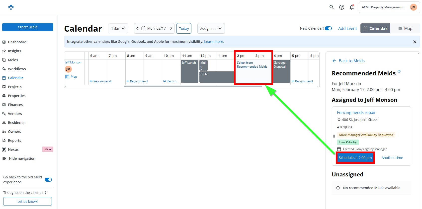 Locate unassigned meld to recommend for time slot selected and click Schedule at 2:00 pm.