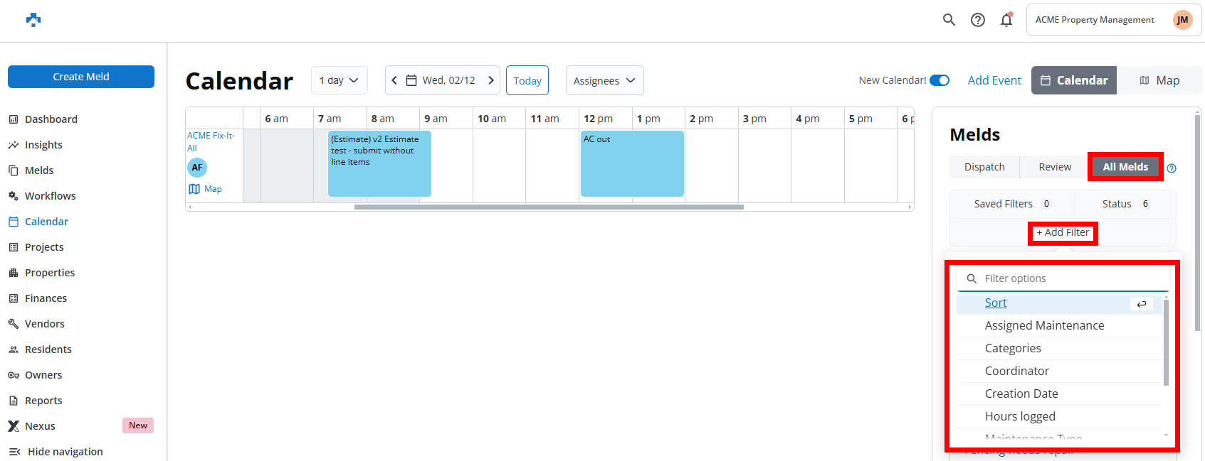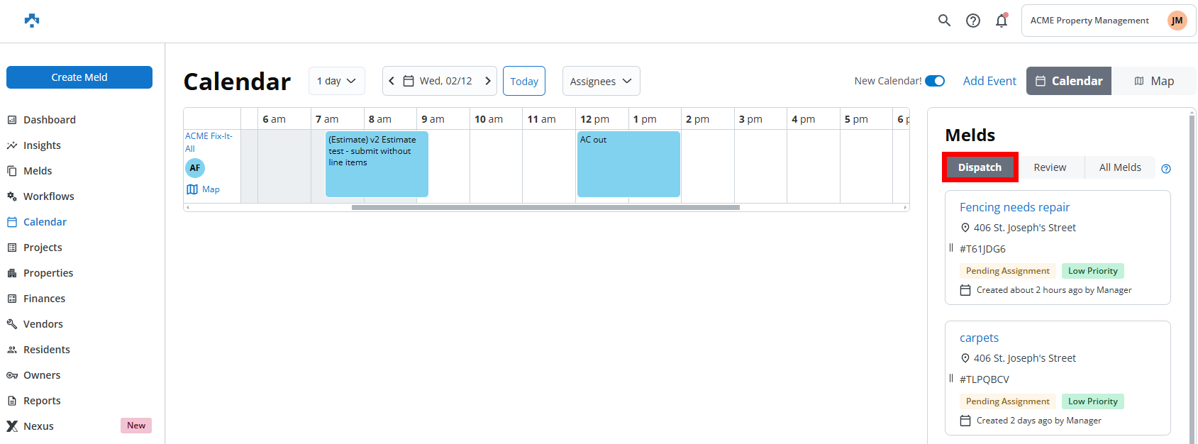 The Calendar Module in Property Meld provides an intuitive way to manage maintenance requests efficiently. To help streamline, Melds are categorized into three key tabs: Dispatch, Review, and All Melds. Each tab serves a specific purpose to help prioritize, manage, and organize Melds effectively.