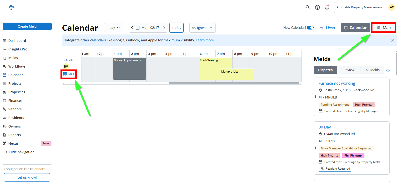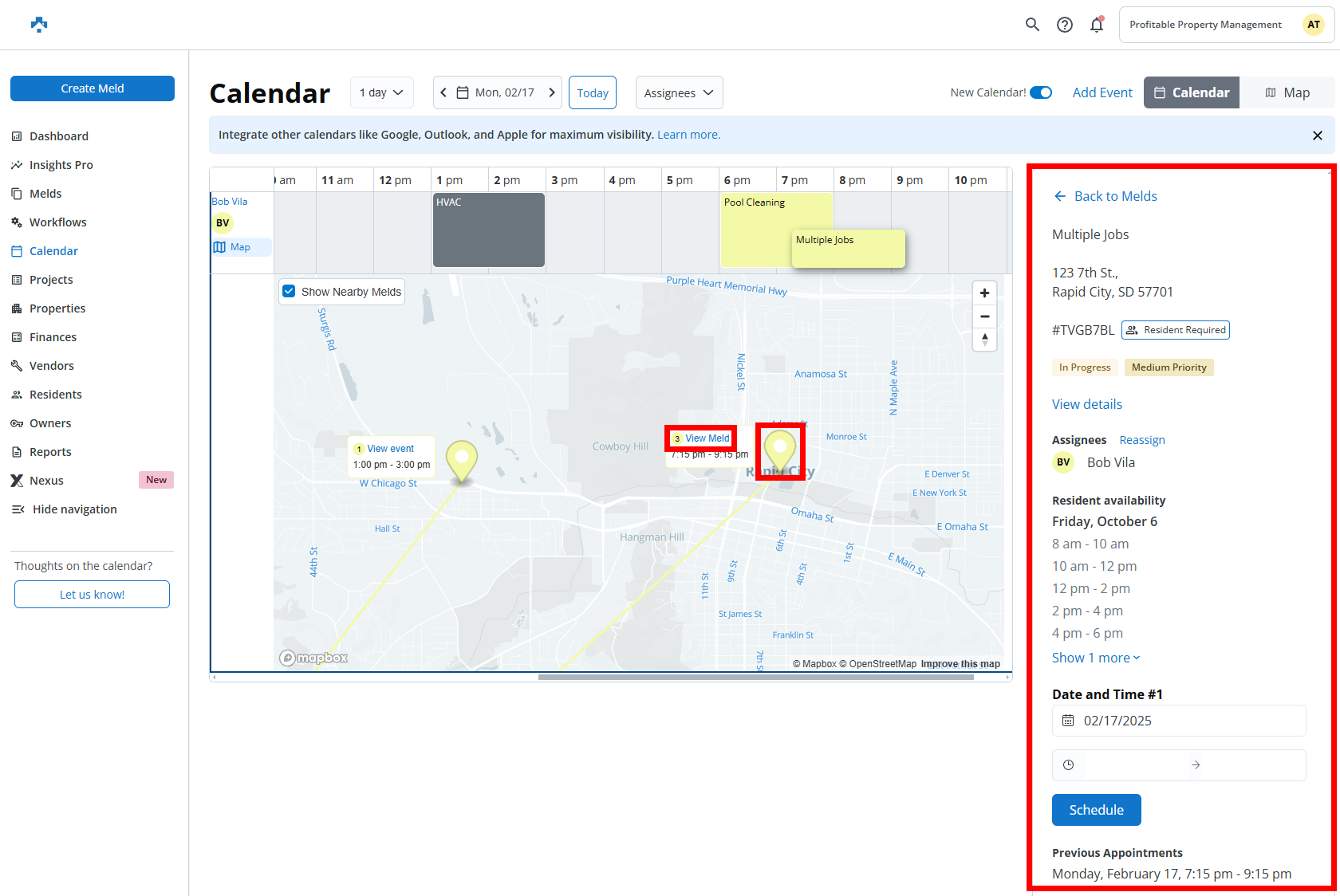 The new Map View feature in Property Meld’s Scheduler 2.0 enhancement provides a visual representation of technician locations and job sites, allowing coordinators to see where technicians are currently assigned and where upcoming appointments are located. This helps in optimizing routes and reducing travel time by enabling users to schedule jobs based on proximity. With this feature, coordinators can easily identify nearby Melds and make scheduling decisions that improve efficiency and minimize unnecessary driving. It's a powerful tool for better managing technician workloads and streamlining operations.