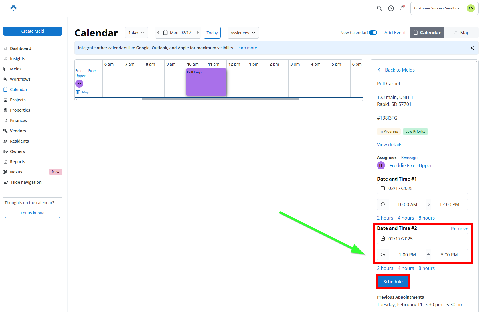 to add the date and time for the additional appointment on this meld, then click Schedule.
