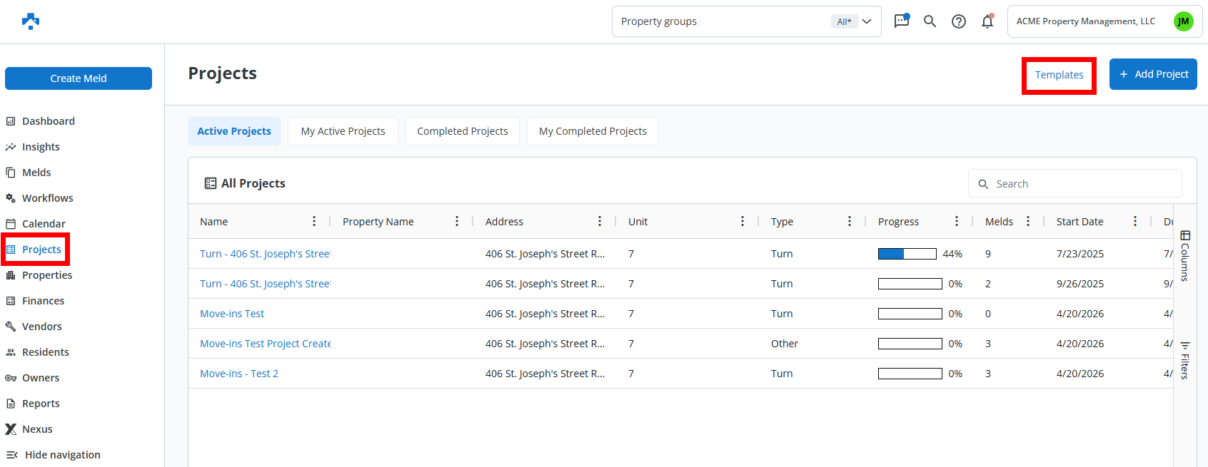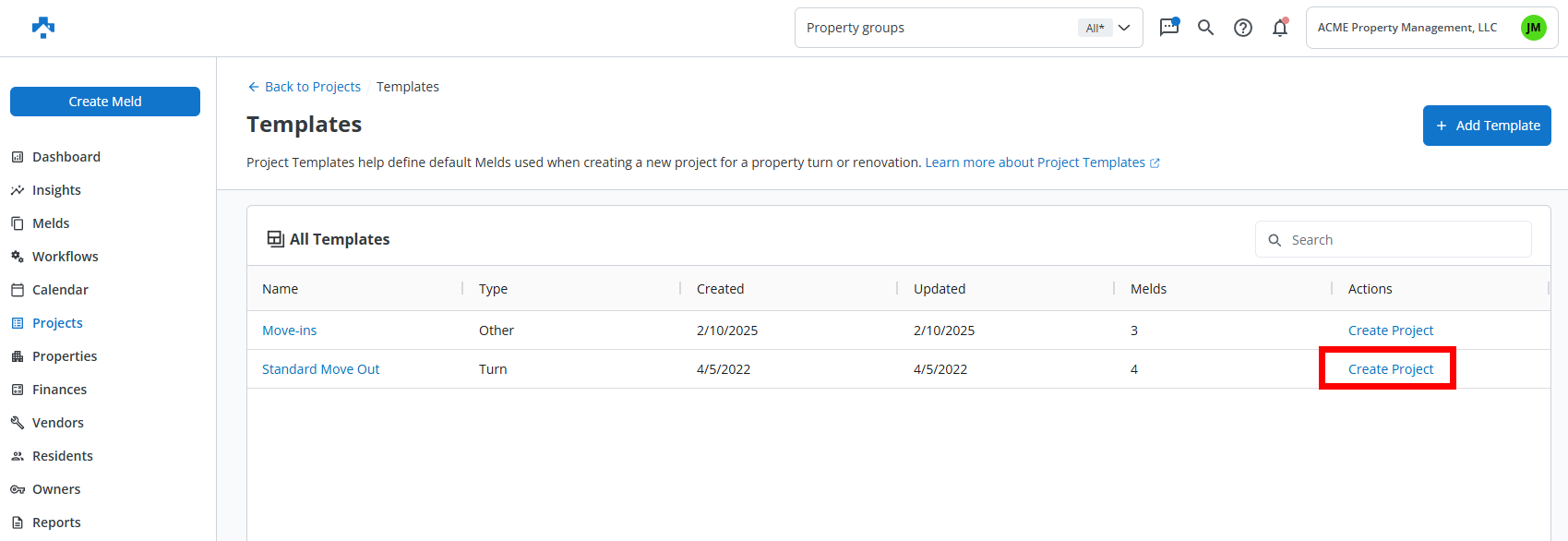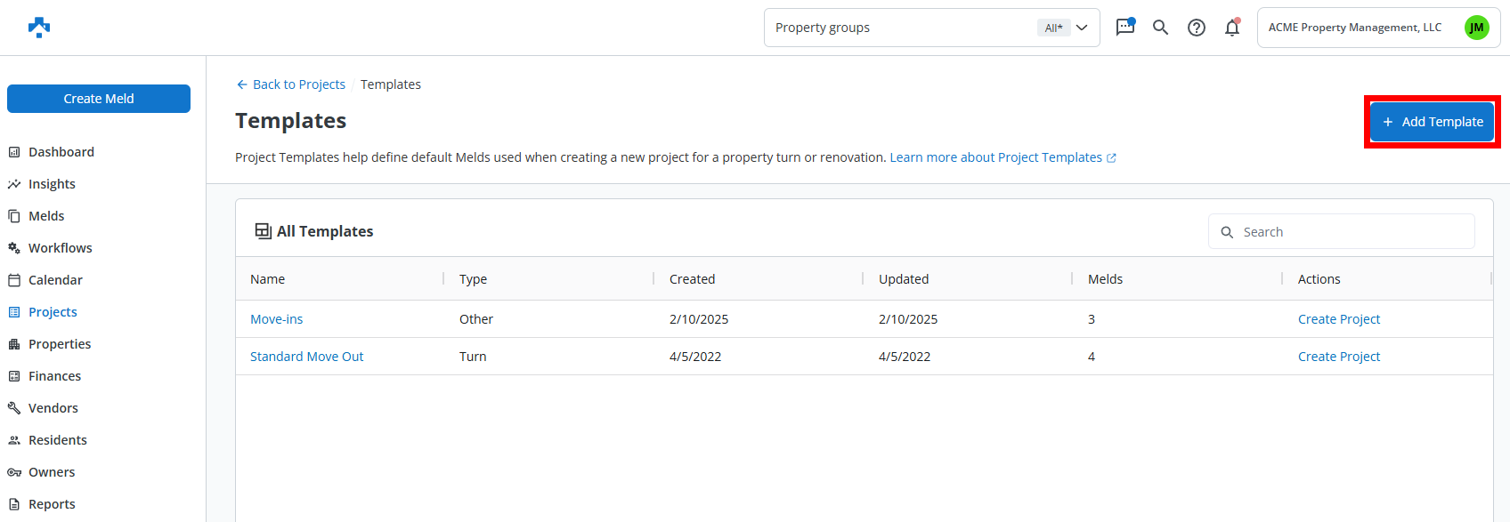 Project Templates in Property Meld streamline your workflows by allowing you to pre-build repeatable sets of Melds. Whether you're prepping for a move-out, renovation, or preventative maintenance cycle, templates help you save time, maintain consistency, and reduce oversight.