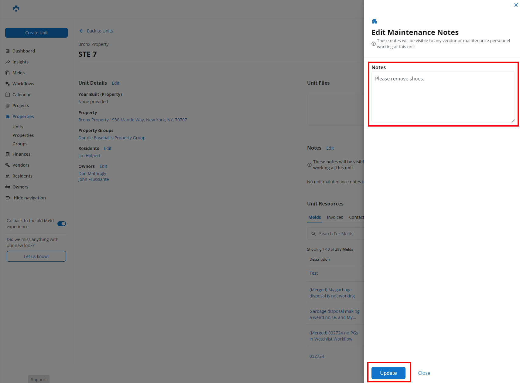 Maintenance Notes are attached to a unit and will be automatically populated with every Meld created for the unit.
