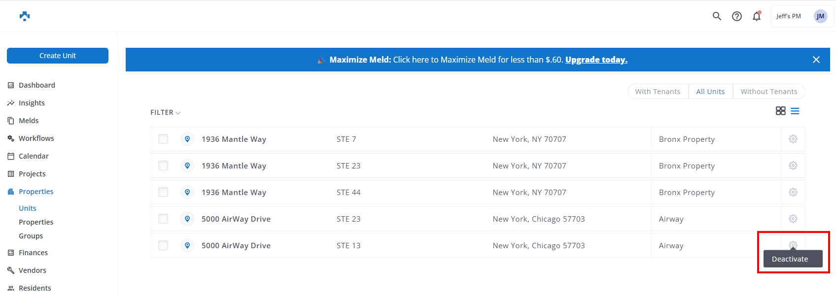 Click then click Deactivate on the desired Unit or Property: