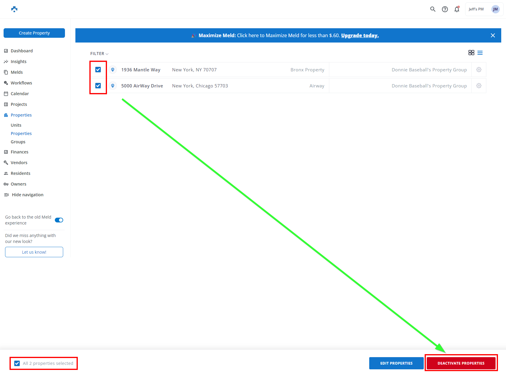 Select Units/Properties to be deactivated by checking their respective boxes. Then click DEACTIVATE PROPERTIES: