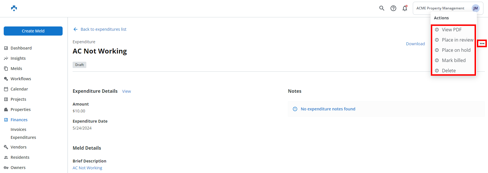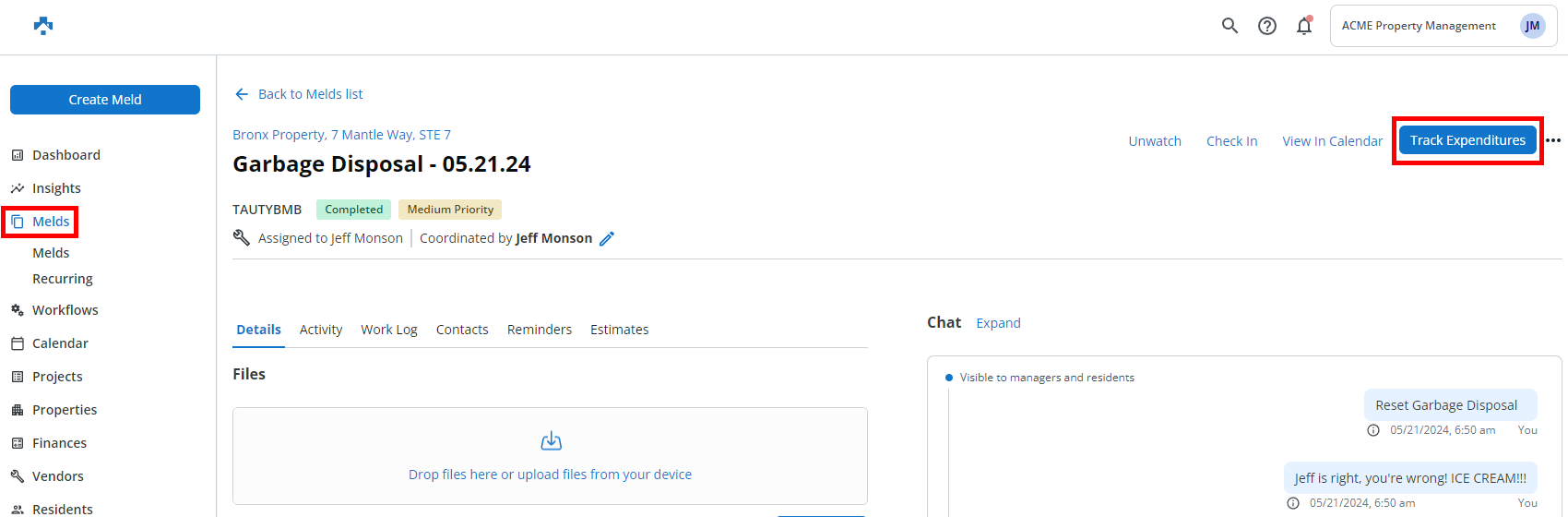 Tracking Expenditures is a tool Internal Technicians and Property Managers can use to attach associated costs to a Meld.