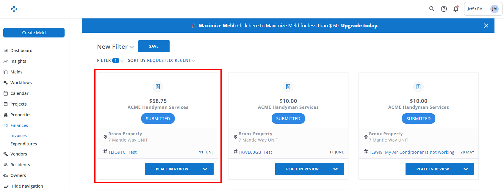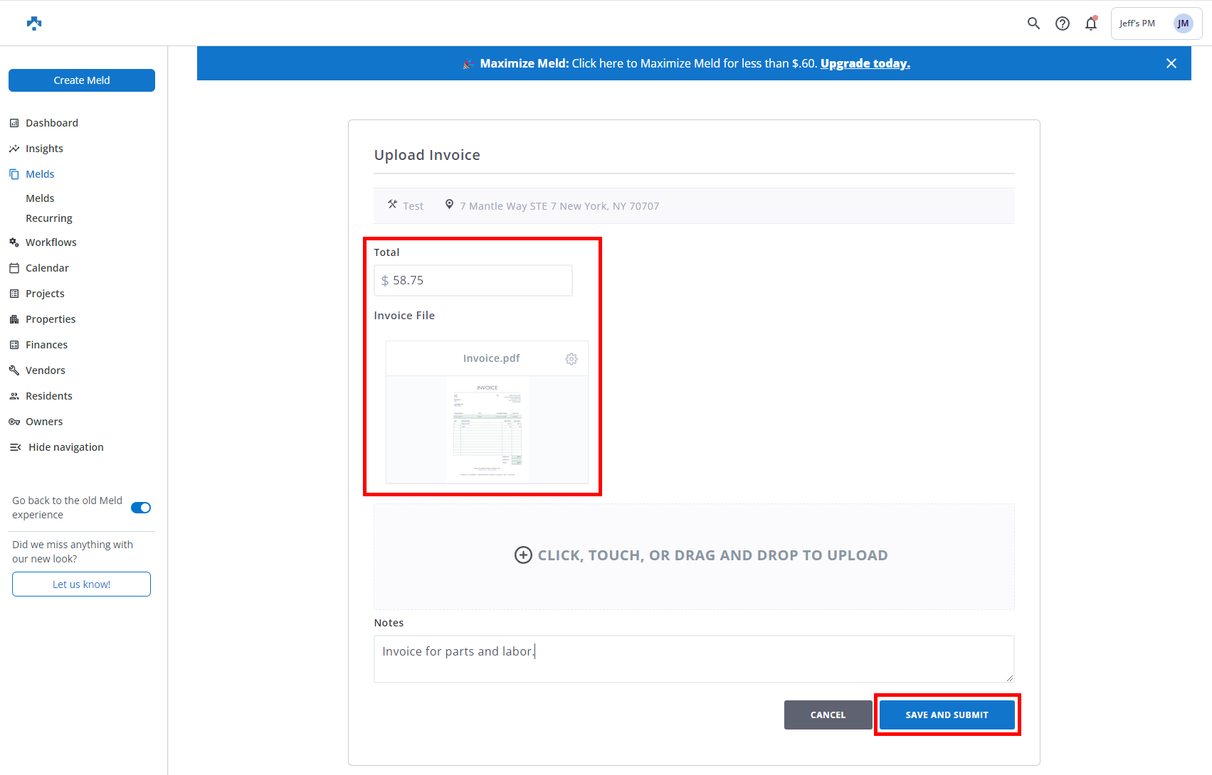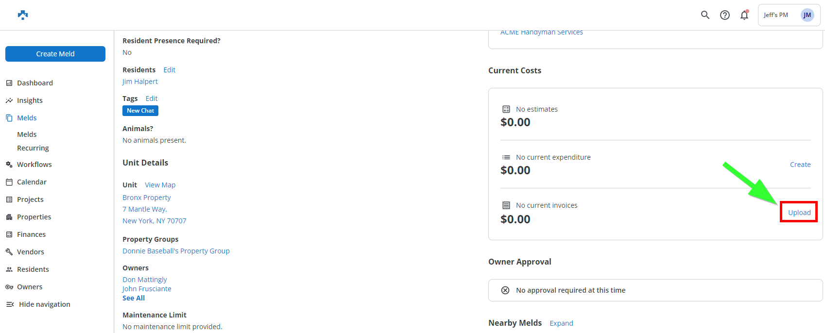 Go to the meld you wish to upload the invoice on, then click on Upload.