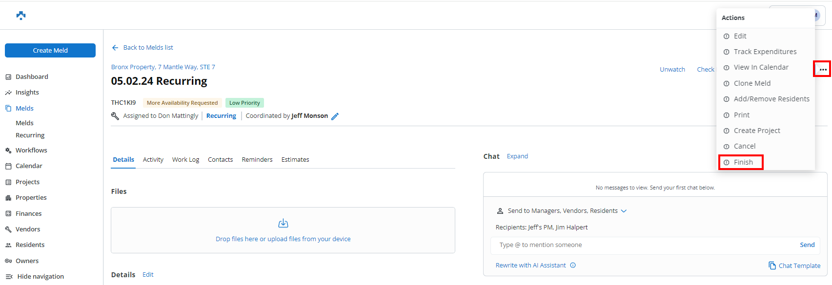 After the work is complete, the Internal Maintenance Technician will need to click and then click Finish Meld.