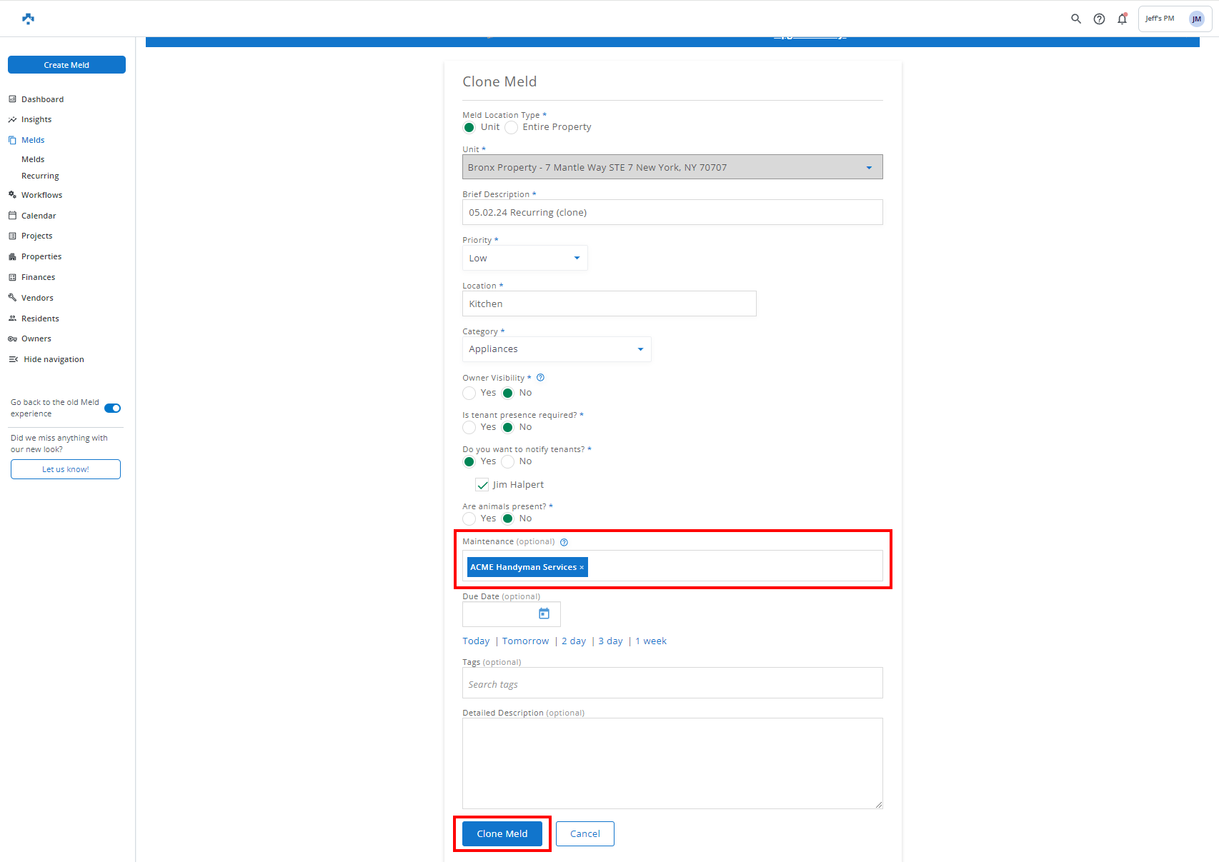 From the newly Cloned Meld, select a Vendor from the Maintenance field, then click Clone Meld.