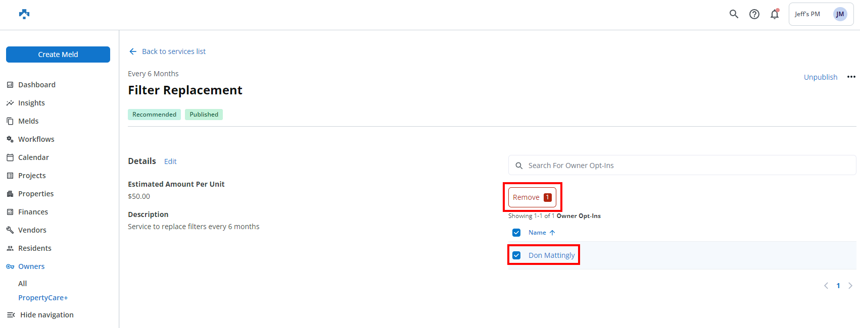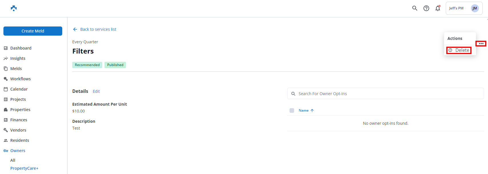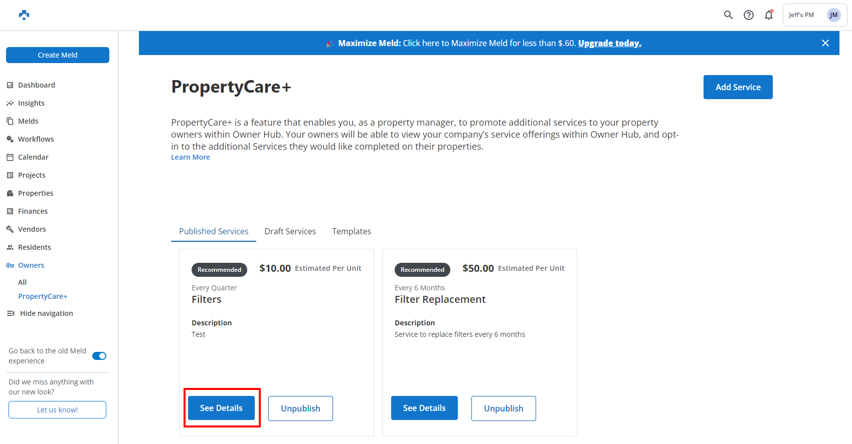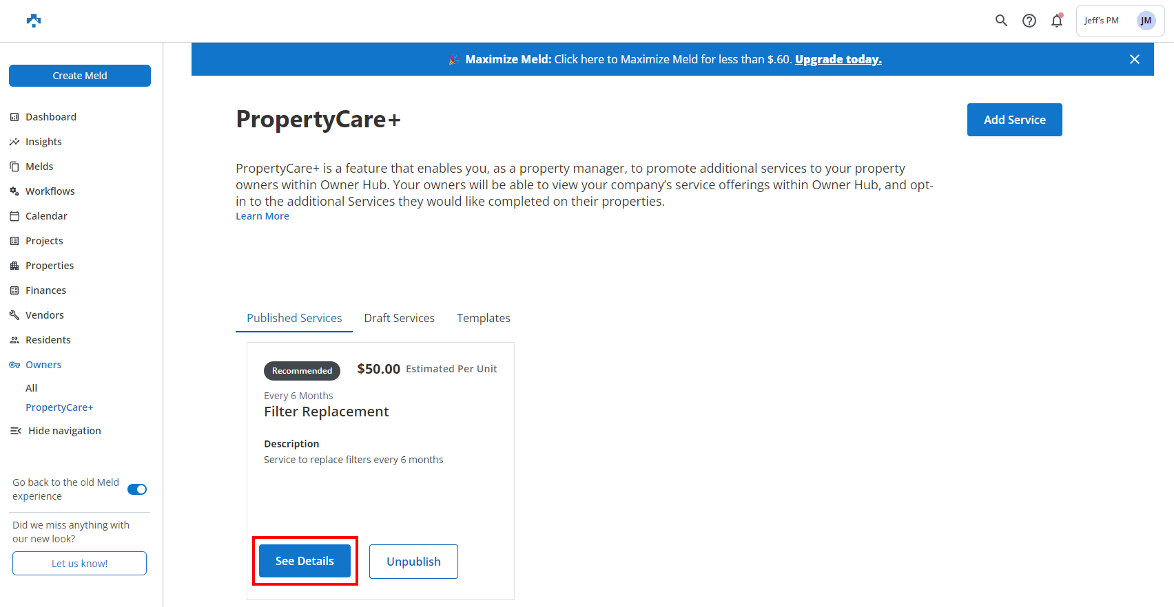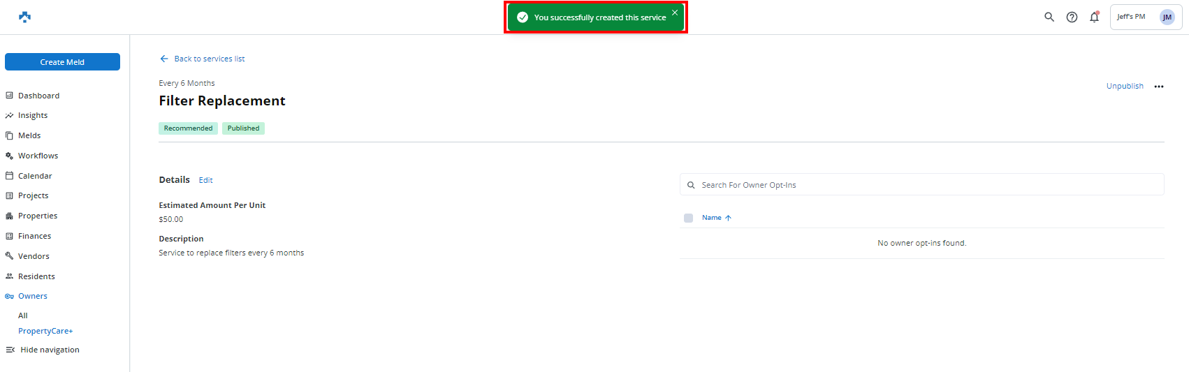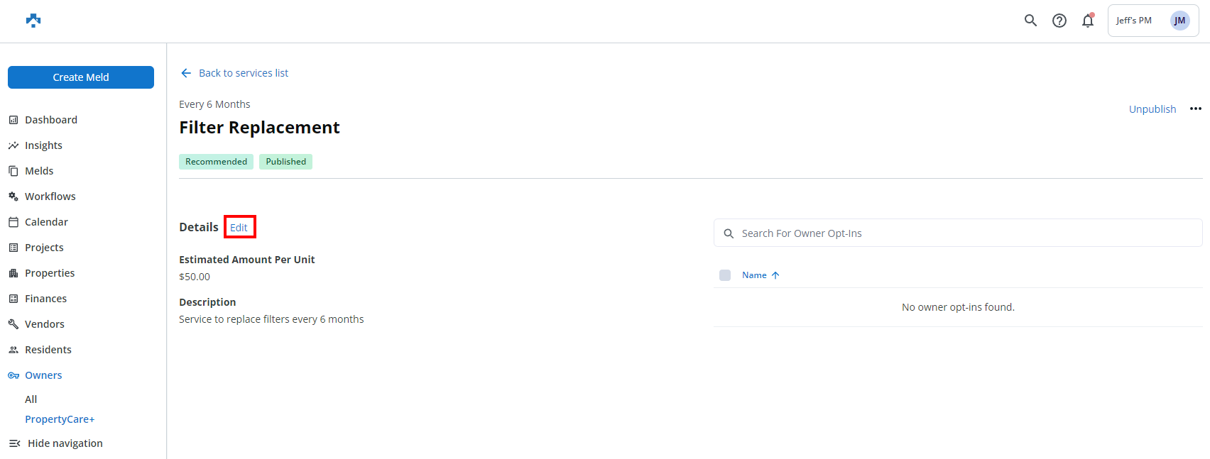 You'll be able to create services with specified descriptions, prices, priorities, and frequencies. Created services will be visible to owners that are registered with the Property Meld Owner Hub where the owner will be able to opt-in. As the property manager, you'll be able to view any opted-in owners within the service detail page. This will allow you to offer preventative maintenance measures to your owners to prevent the expensive repair costs if something were to break. After the owner opts in, you can create a recurring Meld that will automatically generate the Meld for the properties at the appropriate time.