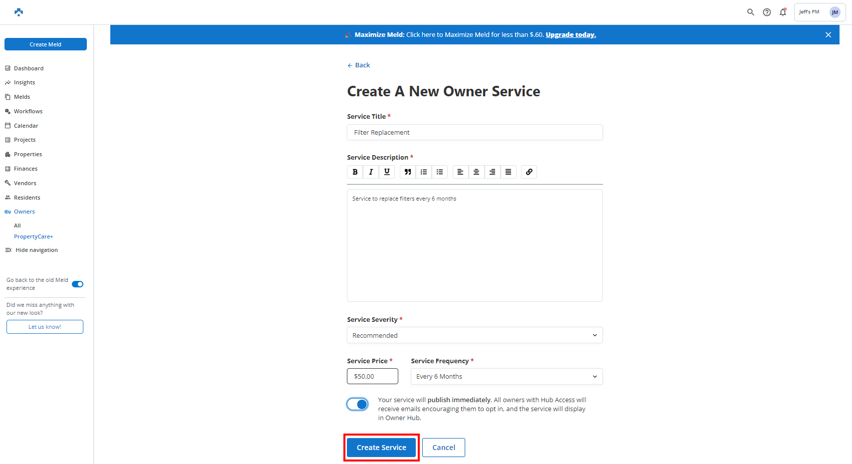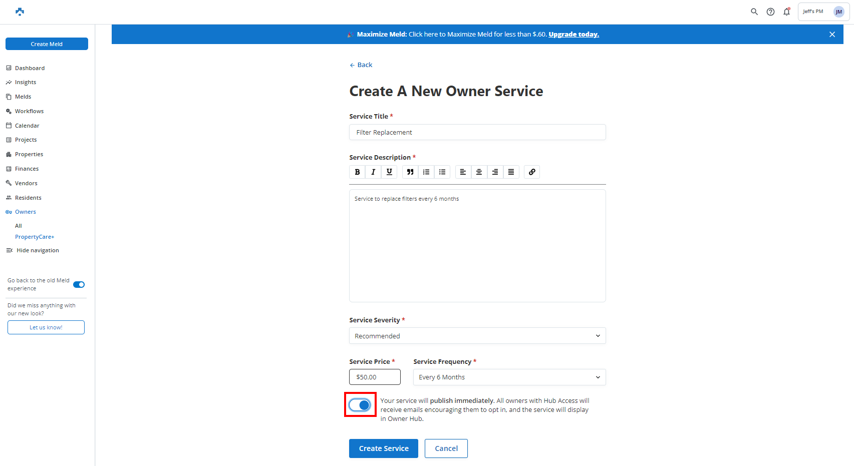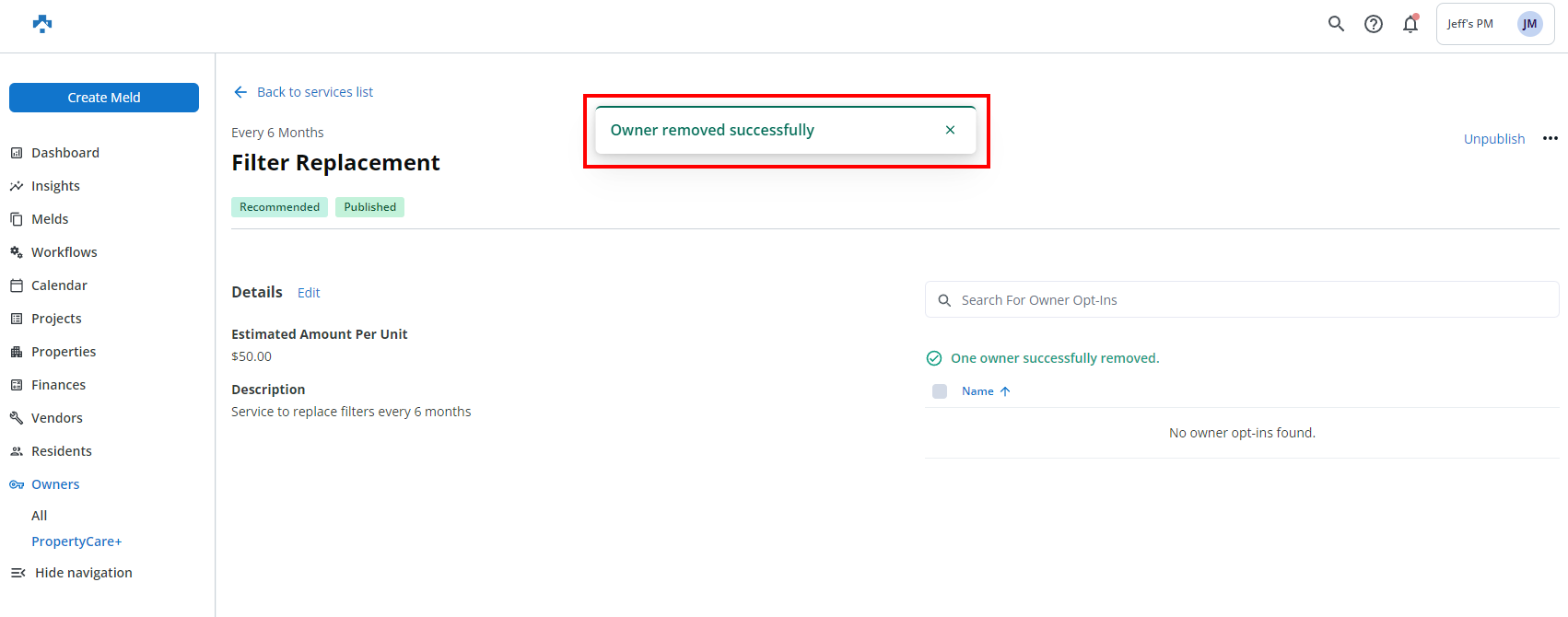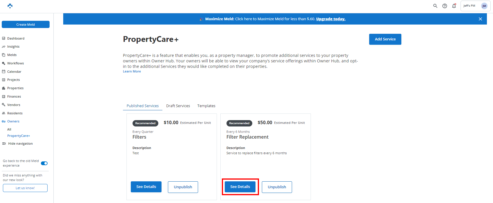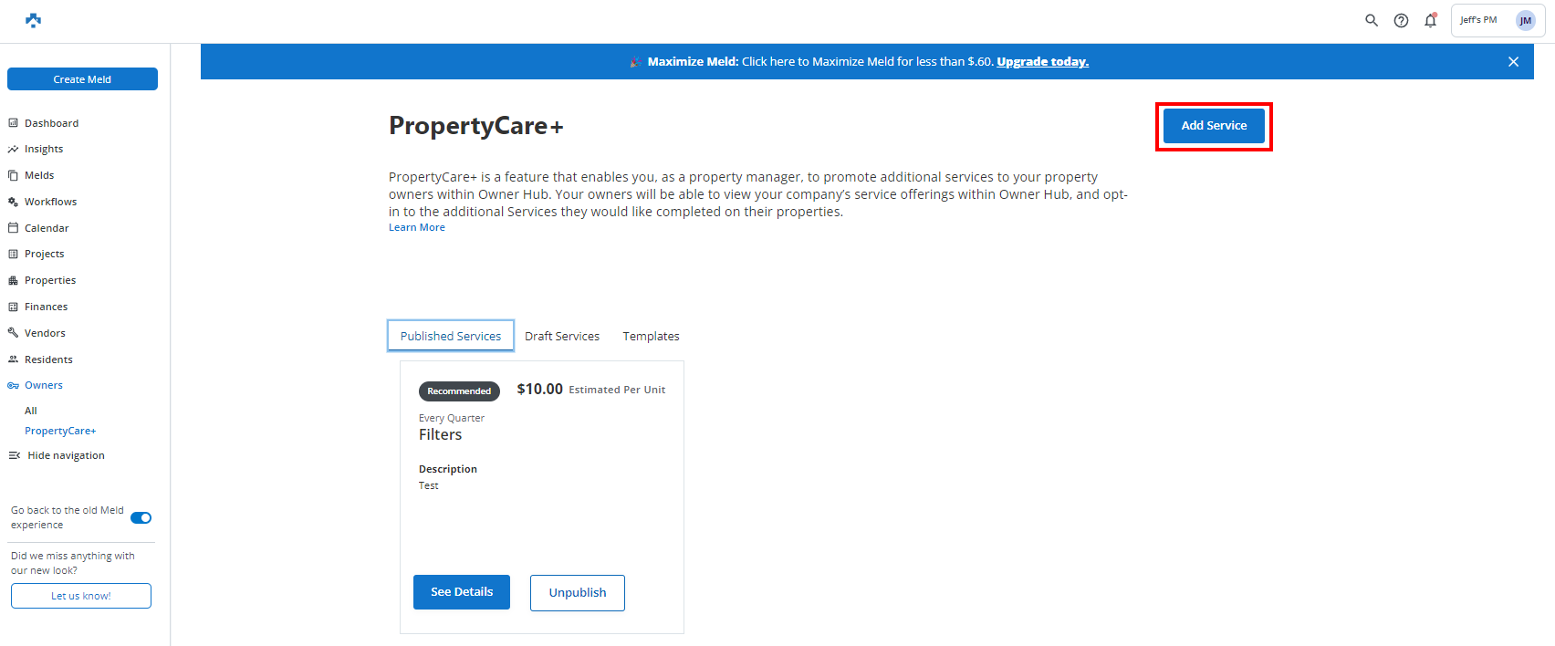 You'll be able to create services with specified descriptions, prices, priorities, and frequencies. Created services will be visible to owners that are registered with the Property Meld Owner Hub where the owner will be able to opt-in. As the property manager, you'll be able to view any opted-in owners within the service detail page. This will allow you to offer preventative maintenance measures to your owners to prevent the expensive repair costs if something were to break. After the owner opts in, you can create a recurring Meld that will automatically generate the Meld for the properties at the appropriate time.