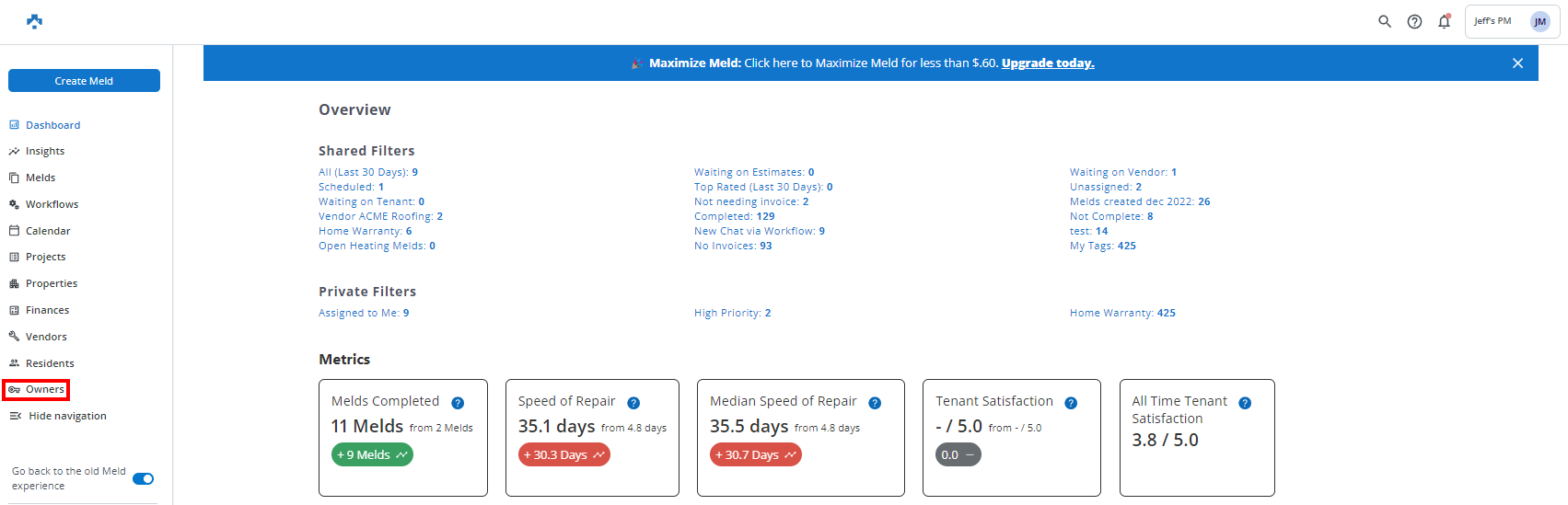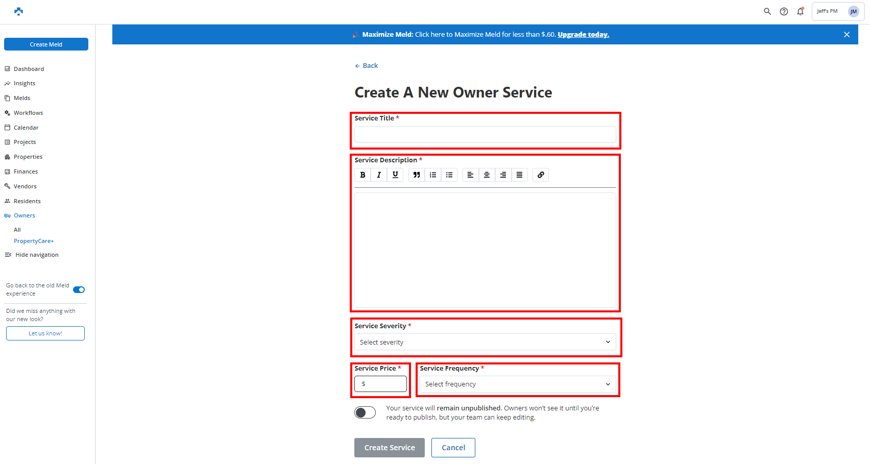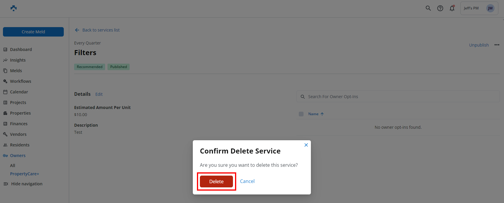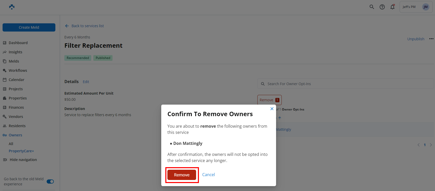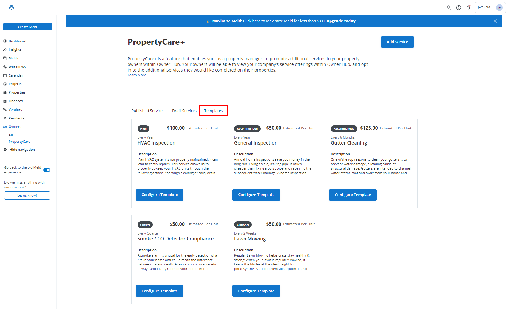 You'll be able to create services with specified descriptions, prices, priorities, and frequencies. Created services will be visible to owners that are registered with the Property Meld Owner Hub where the owner will be able to opt-in. As the property manager, you'll be able to view any opted-in owners within the service detail page. This will allow you to offer preventative maintenance measures to your owners to prevent the expensive repair costs if something were to break. After the owner opts in, you can create a recurring Meld that will automatically generate the Meld for the properties at the appropriate time.