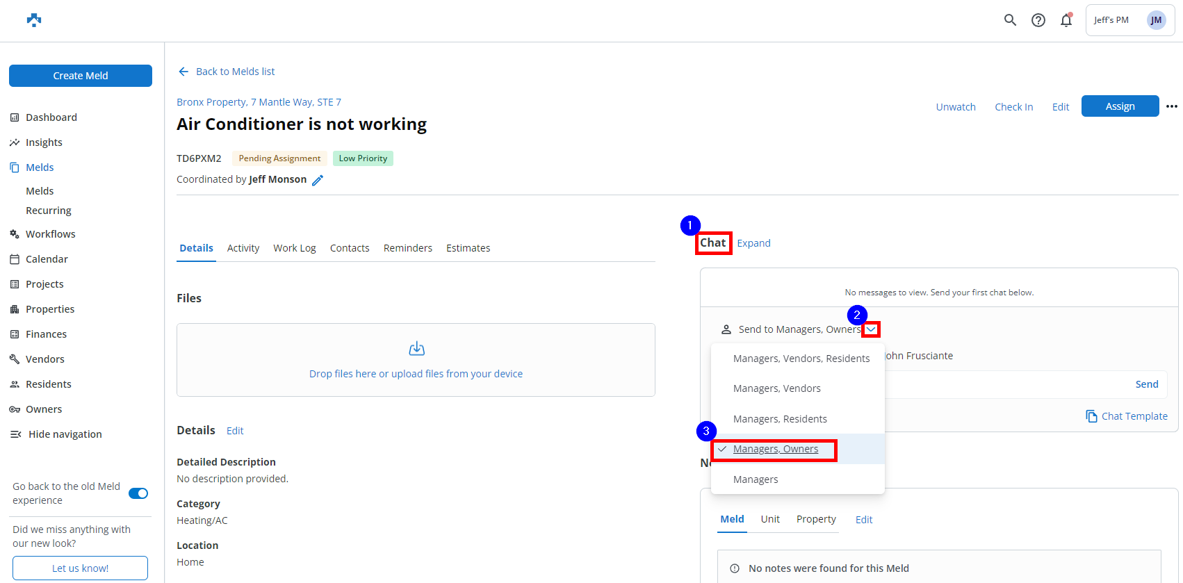 Property managers can communicate directly with owners on a Meld using the Property Meld chat feature. When a property manager uses the chat feature to send directly or include the owner in a message, the owner will receive an email notification, a notification within Owner Hub , and/ or a text message.