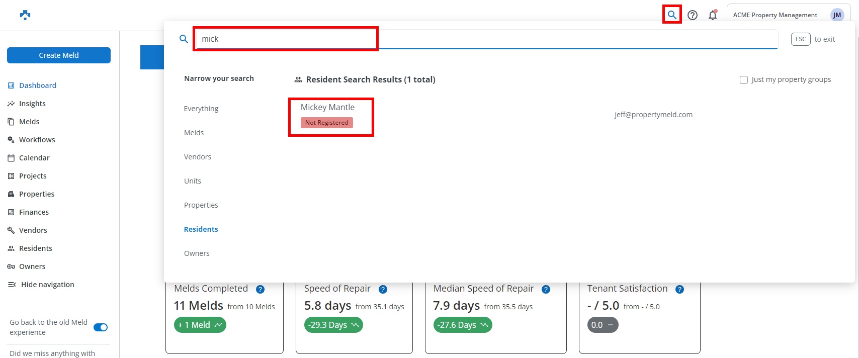 Using Search, click on and enter the name of the Resident to be Invited. Click on the Resident to display the Resident.